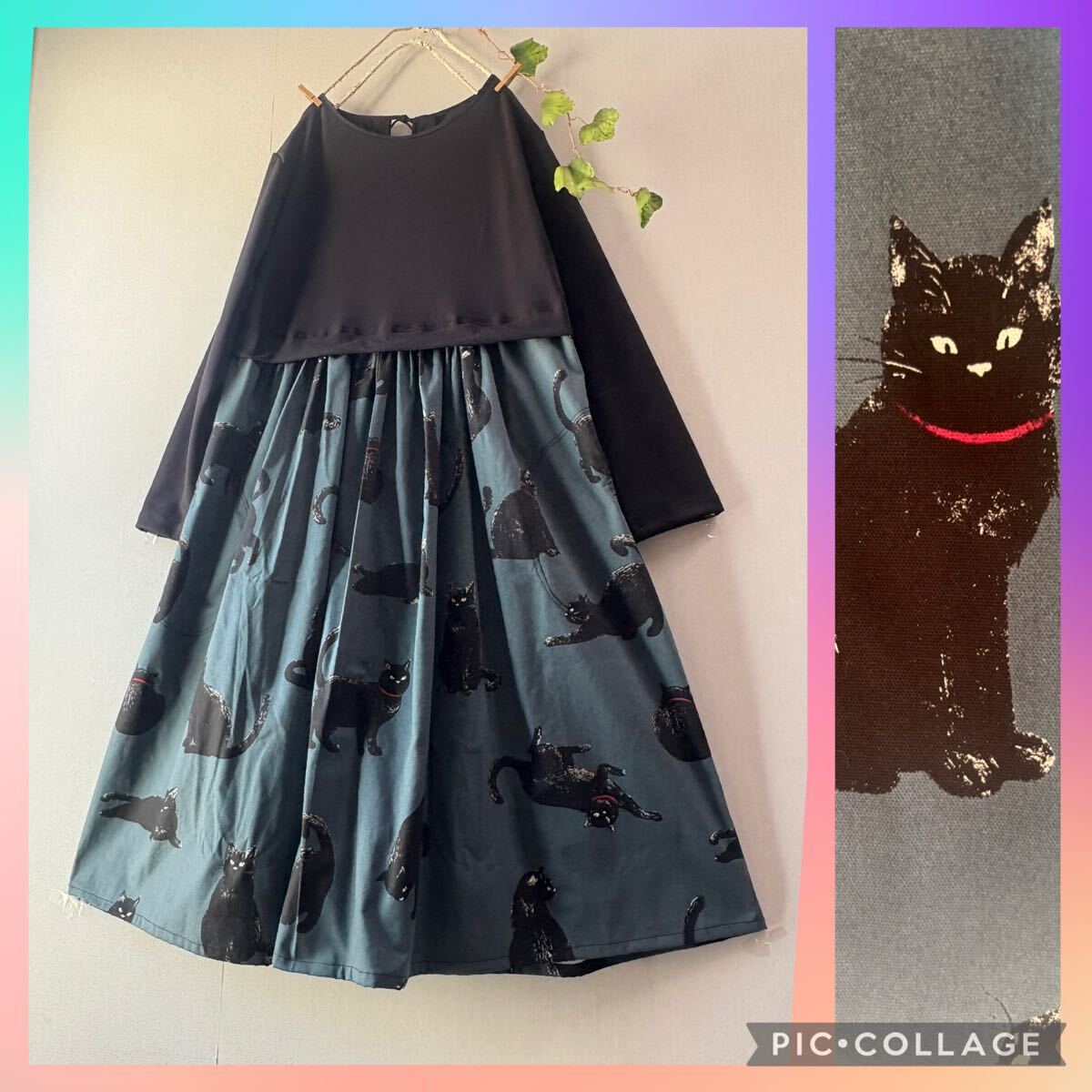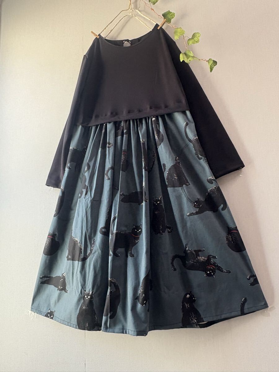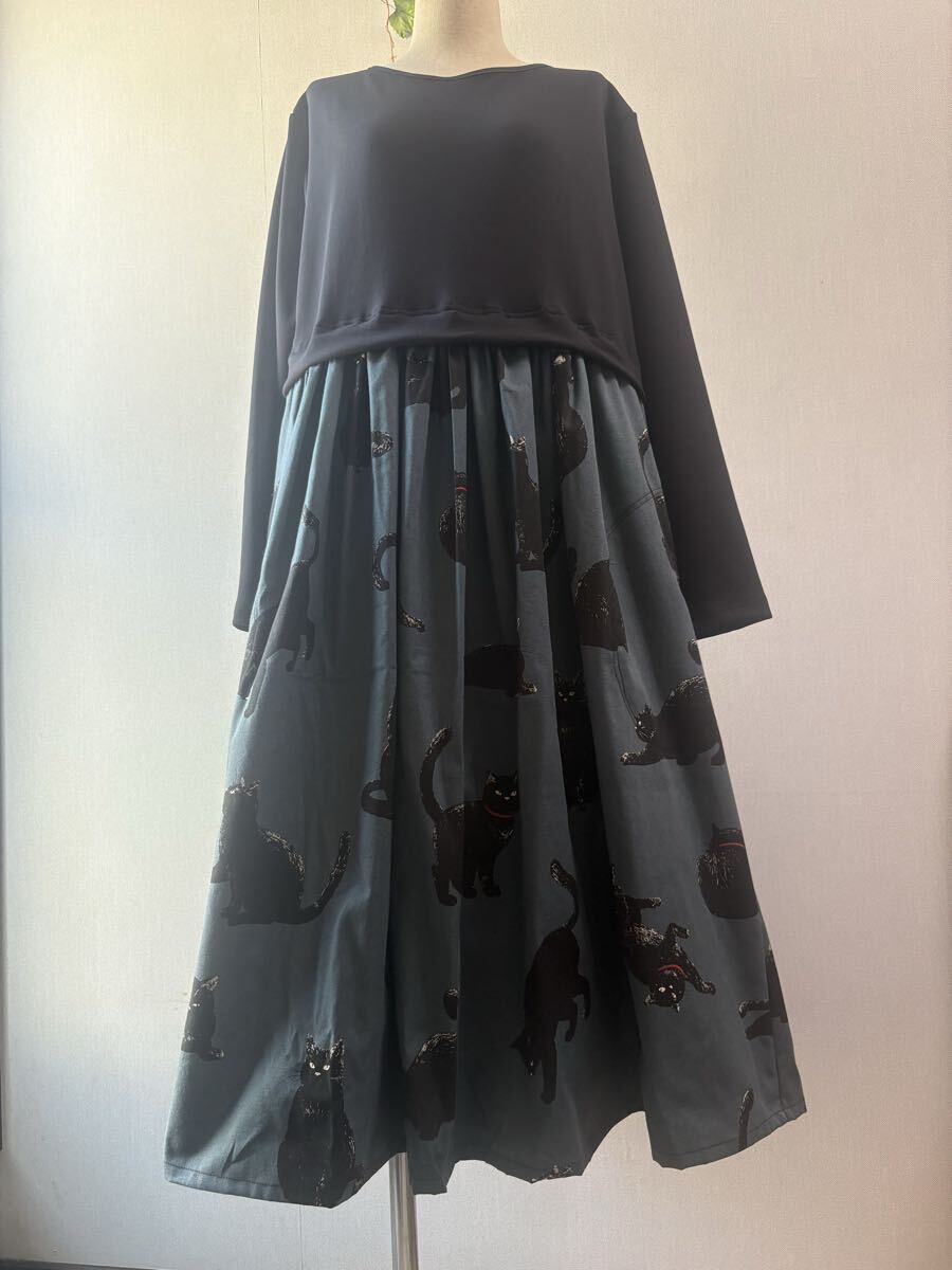 スカートが猫柄のワンピースです。 背中のリボンもポイント! 両サイドにポケット付 柄:コットン/リネン素材 無地部分:伸びるニット生地 ポリエステル/コットン/ウール 一点一点手作りした品です。 サイズ:フリーサイズ <平置き寸法> 身丈108cm・脇下身幅48cm 肩幅44cm・袖丈54cm ※丈詰め・ポケット付けなどのお直しは承っておりません。 | |||