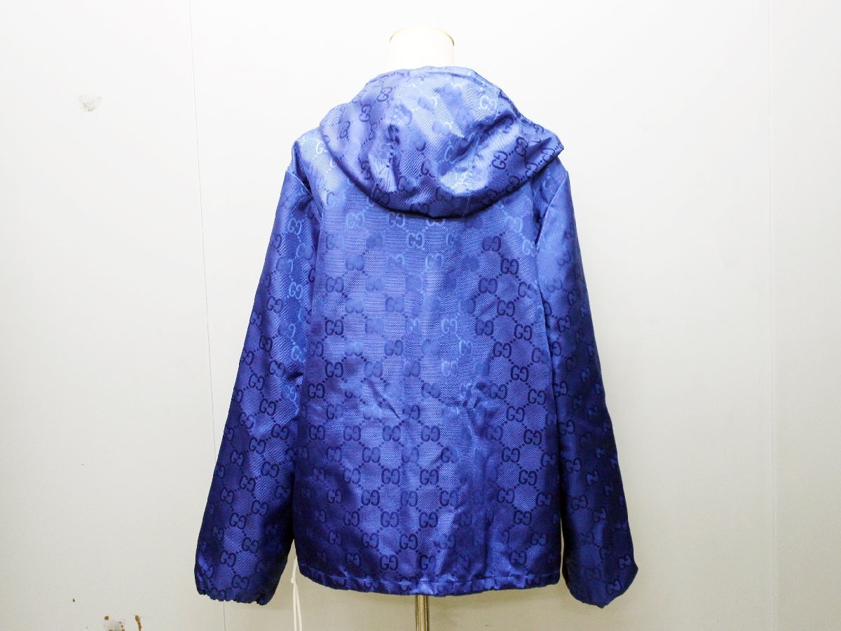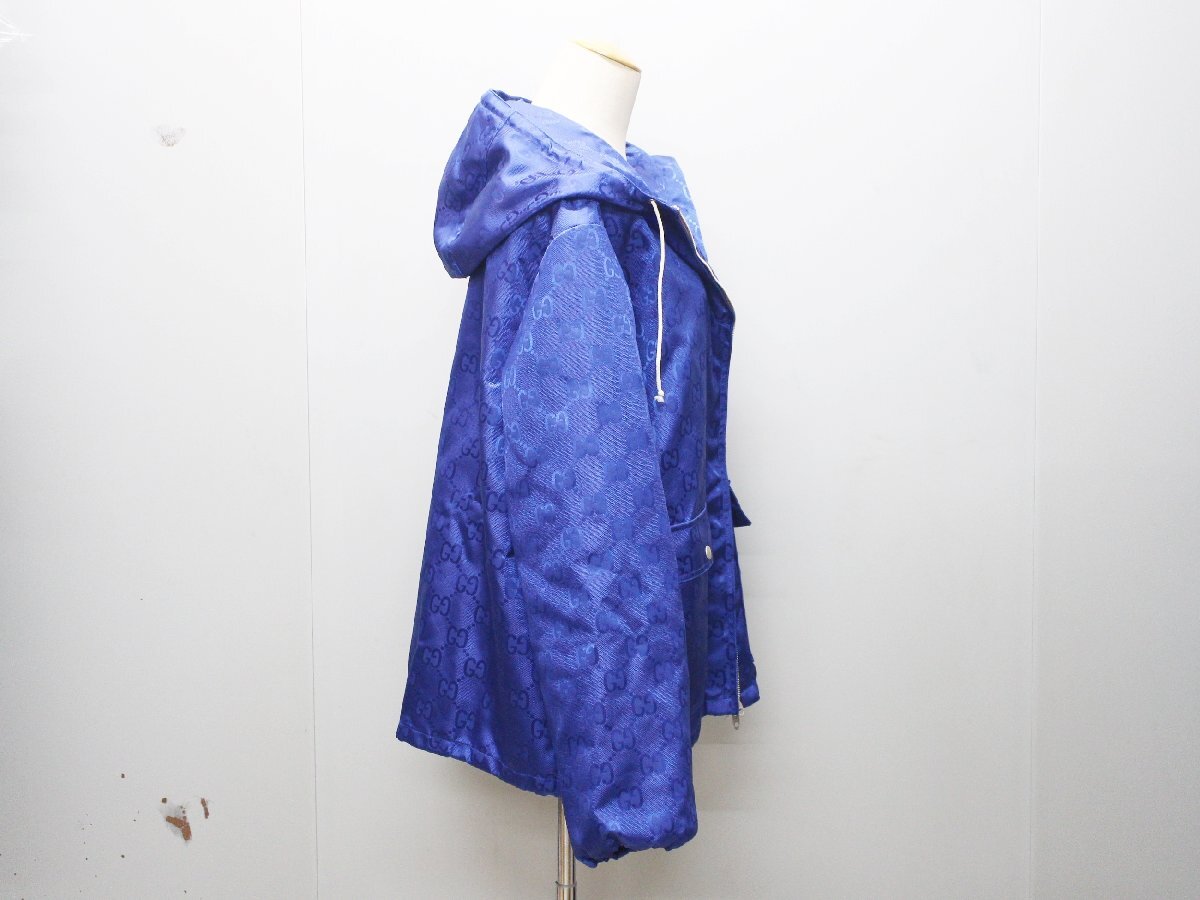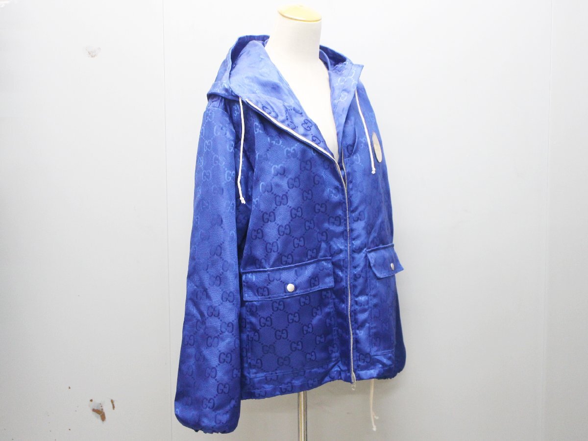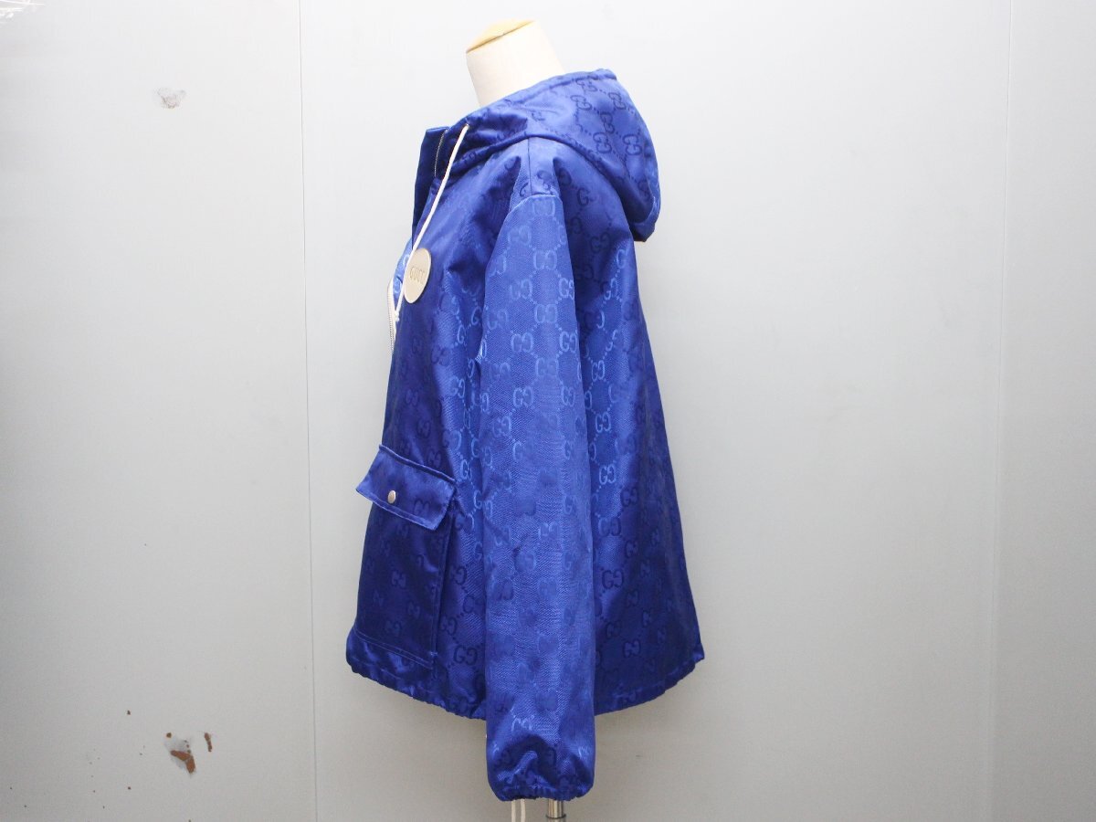 鮮やかなコバルトブルーに、GGモノグラムの総柄が上品に浮かび上がるフード付きジャケットです。タウンユースはもちろん、旅行やレジャーにも最適な軽快
