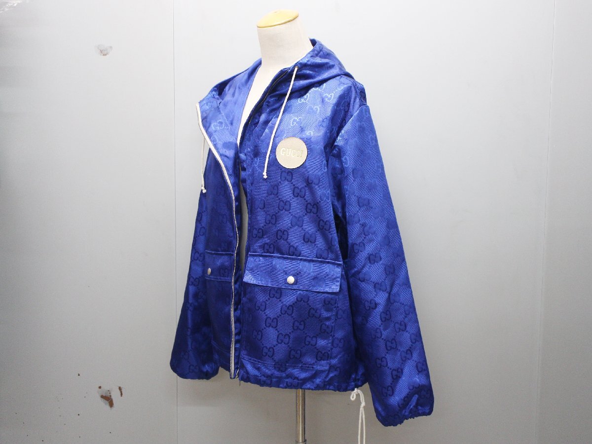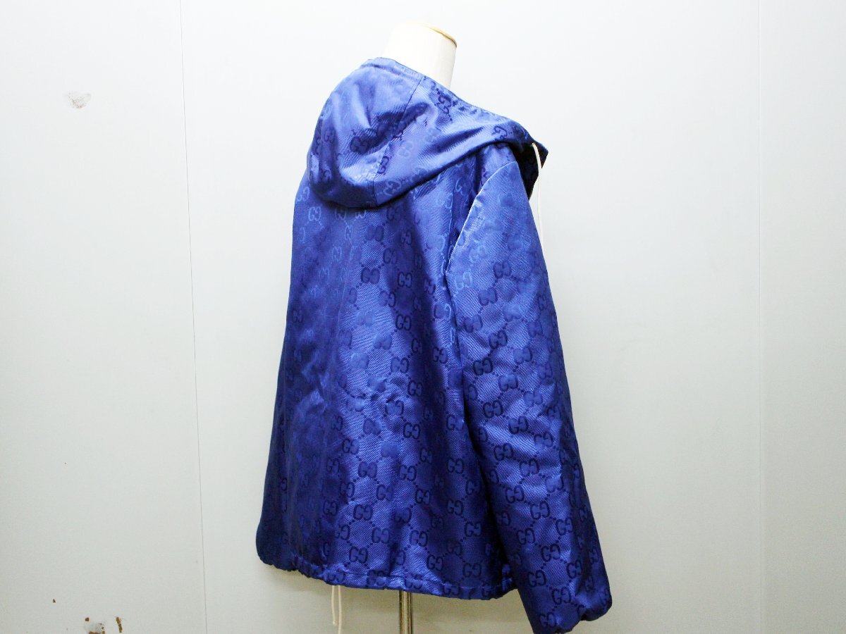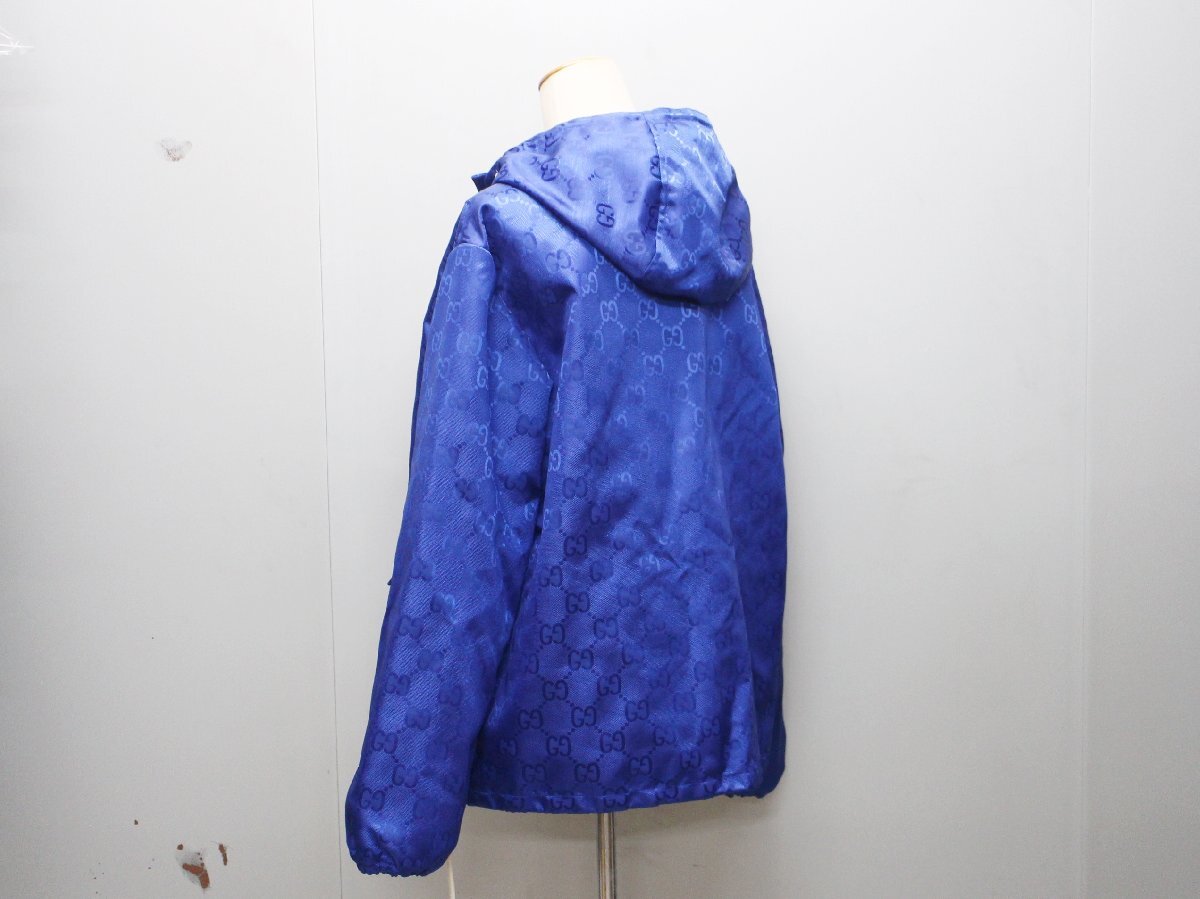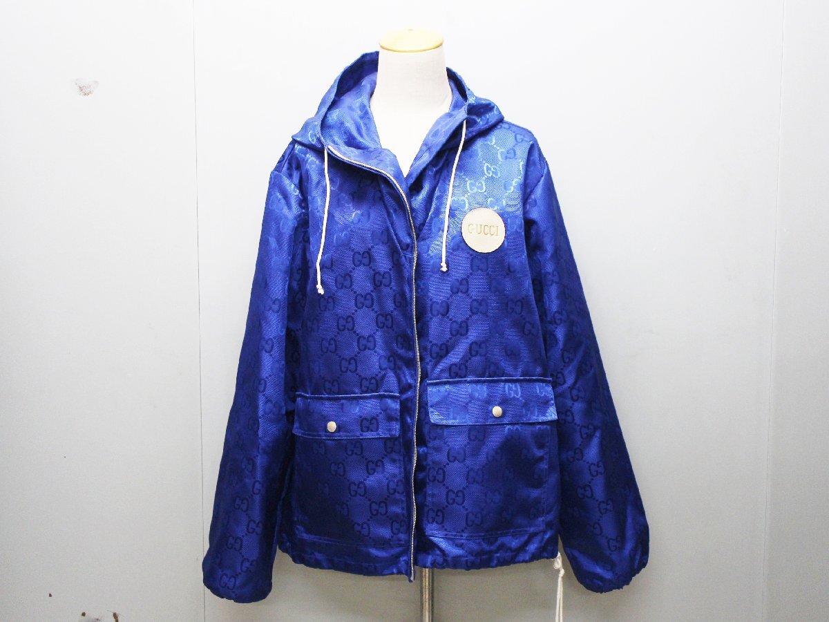 鮮やかなコバルトブルーに、GGモノグラムの総柄が上品に浮かび上がるフード付きジャケットです。タウンユースはもちろん、旅行やレジャーにも最適な軽快