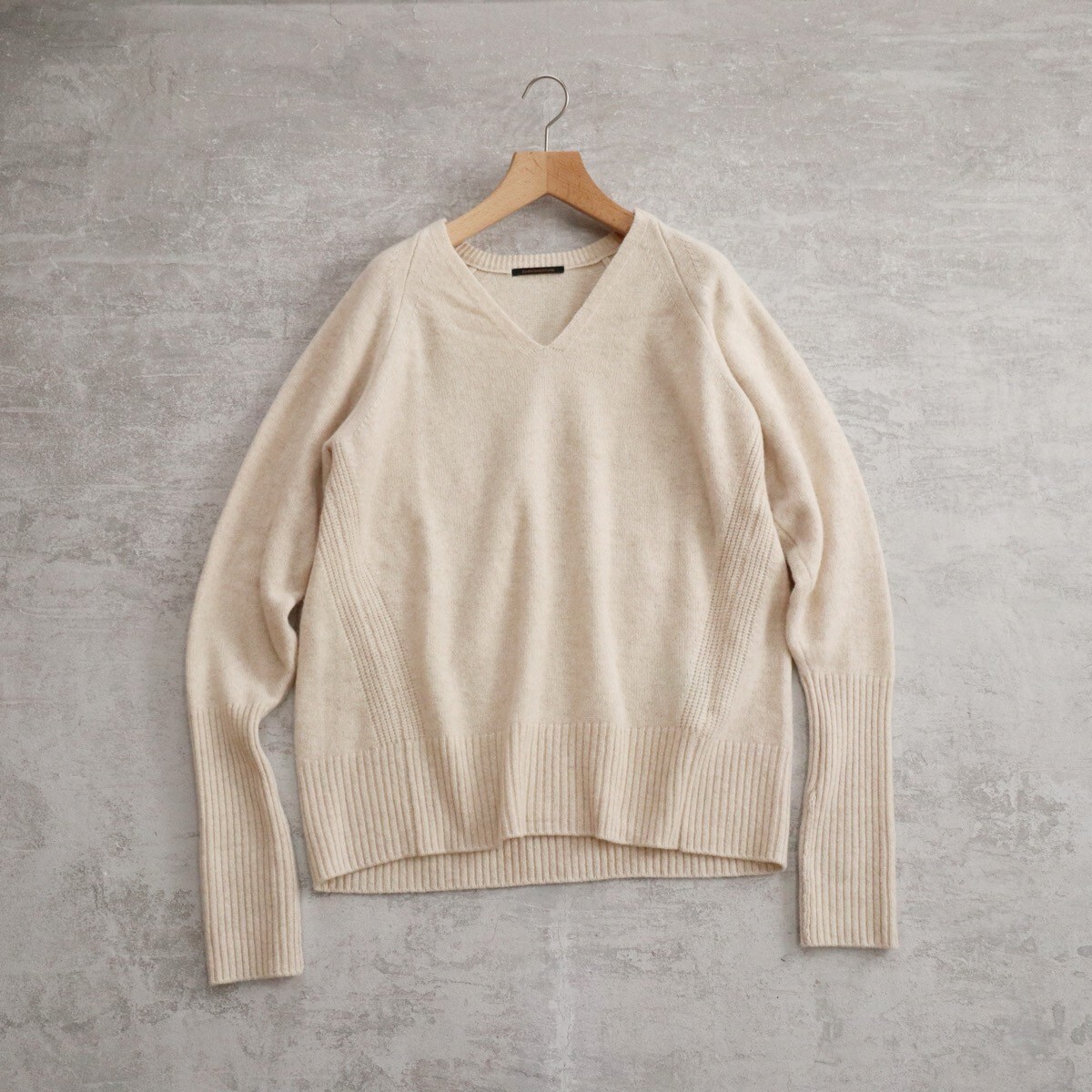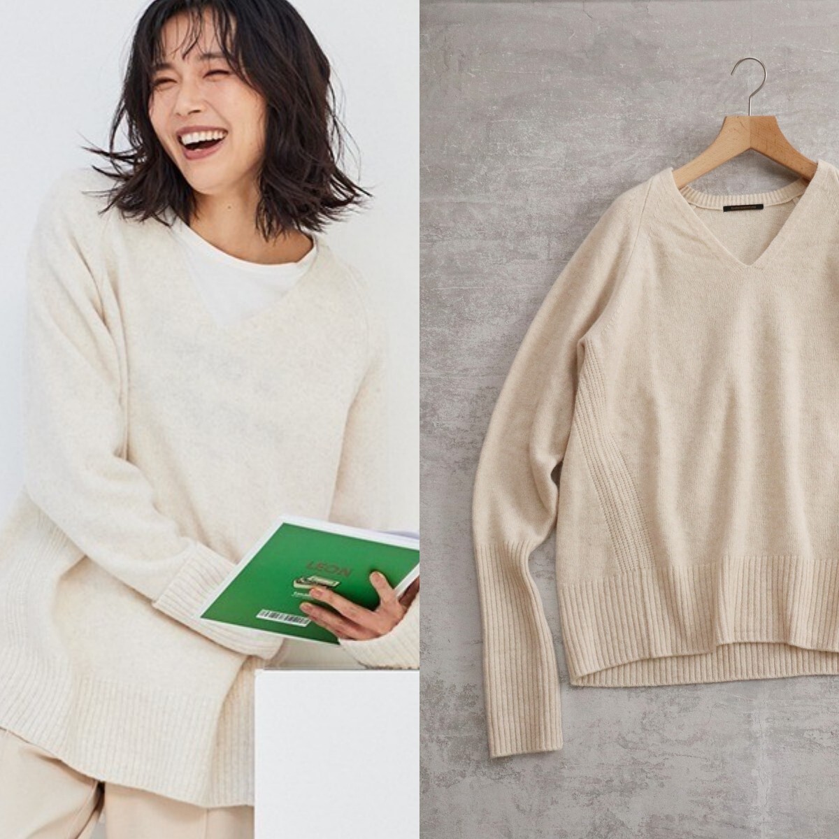 華奢な襟元と丸みのあるバックコクーンのシルエットのニットです。