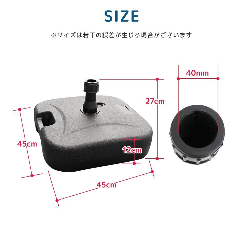 | パラソルベース 21kg 中に水を入れて使用するパラソルベーススタンド。 ガーデンやベランダでのパラソルの使用でオススメ! 使用後は中の水を抜けば軽くなるので持ち運びにも便利です。 本体は取っ手付きなので持ち運びがラクラク! ポール受けキャップは本体に収納できます。 パラソルスタンド以外にも、のぼり等のスタンドに最適! |