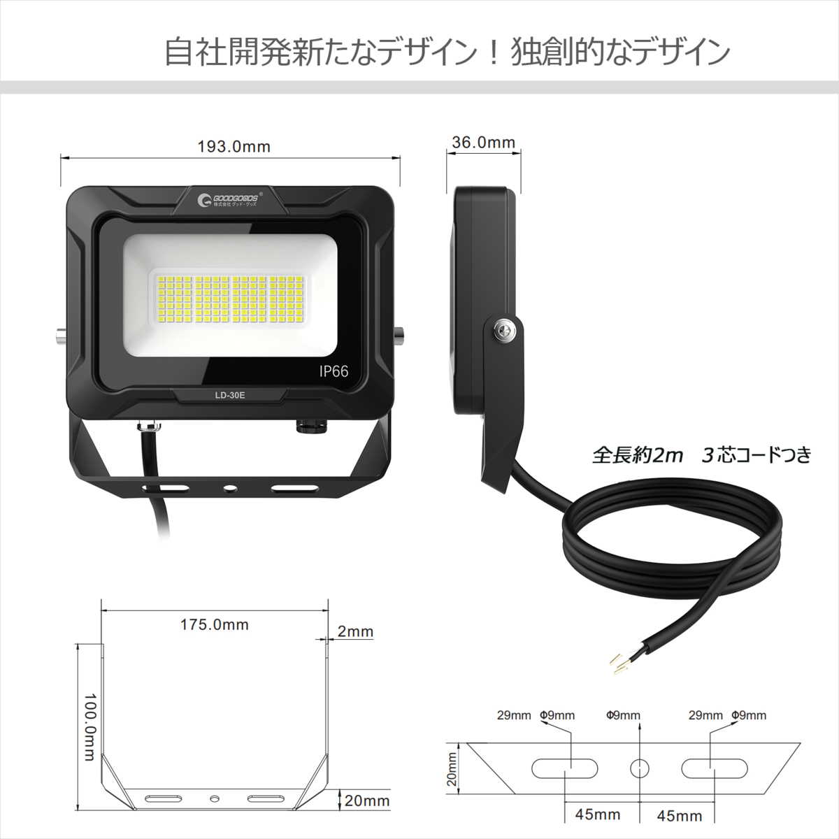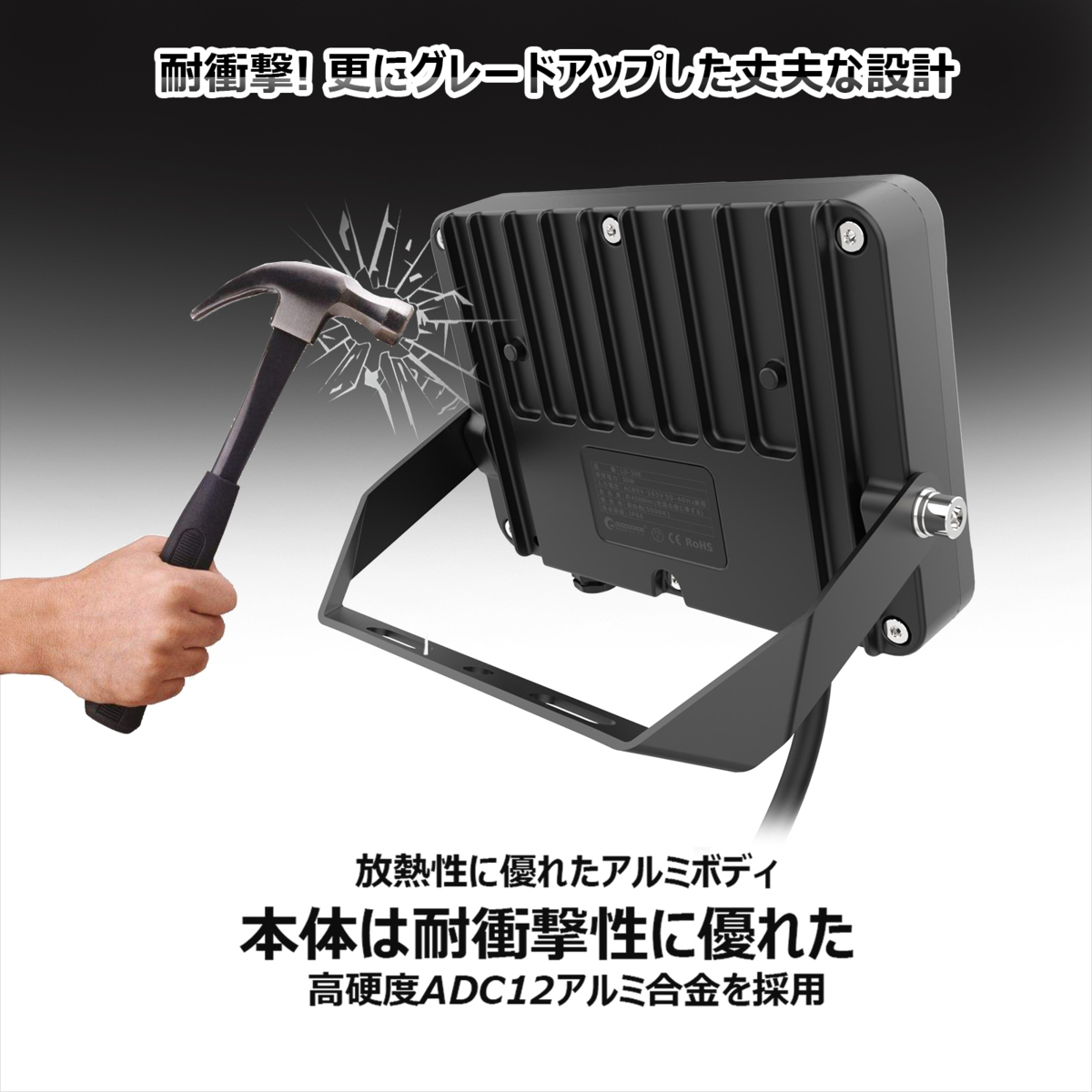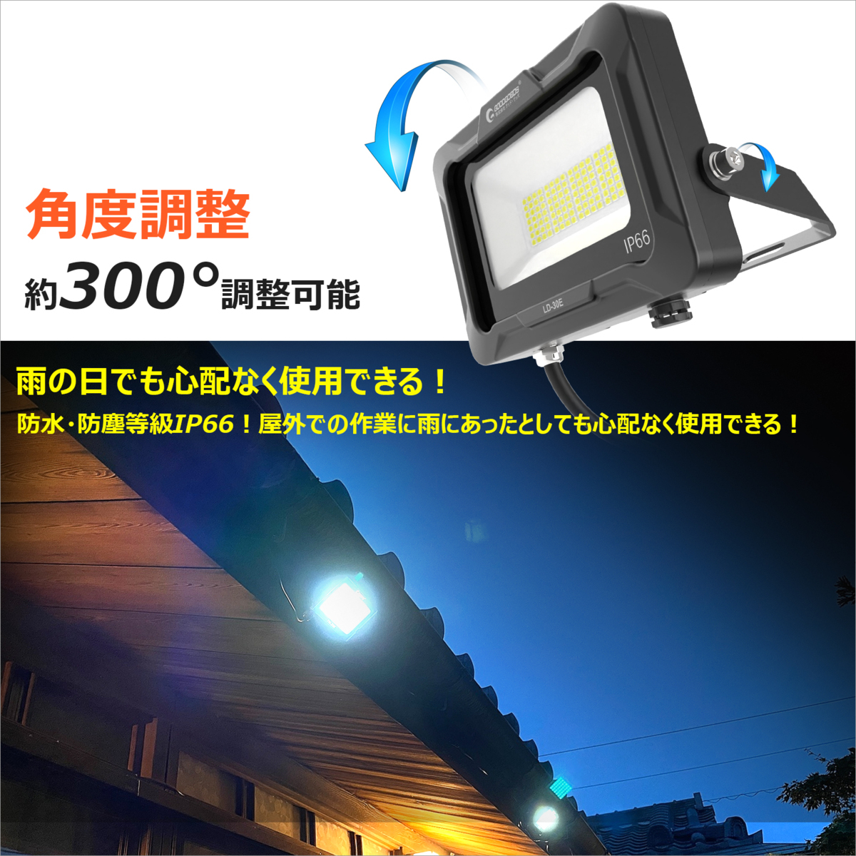 ポイント1:【LED・高輝度】 ◎112個高品質なLEDチップを30W投光器に初採用、約4500lmの圧倒的な明るさを実現し、120°の広範囲を照射します。 ◎省電力・小出力のSMD高効率LEDチップを採用することで、チップの発熱量を抑え、散熱効率を高くなります。効果よくLED周辺の熱だまりを防げ、使用寿命が延ばせます。 ◎すりガラスの採用!ガラス面には、すりガラス加工を施し光が拡散し、刺激的な眩しさを軽減します。 ◎ライト近くに影ができにくく目に優しく照射します。色温5000K 自然光に近い昼白色明るいのに眩しくないです! ポイント2:【2Mコード・PSE表示付き】 ◎コード長2M!コンセントまでの距離がある場合でも安心です。 ◎長さ2Mの電源コードはPSE表示付きの安心品質です。 ◎ステー300°角度調整と照射120°範囲が作動スペースを更に増大できます。 ポイント3:【一体型放熱フィンデザイン】 ◎一体型放熱フィンデザインを採用します。 ◎放熱性に優れているアルミボディー、ADC12アルミダイカスト素材を採用します! ポイント4:【アルミ素材+強化ガラス】 ◎アルミ素材+強化ガラスを贅沢に使い、従来品より耐久性が格段に向上しています。耐衝撃、耐振動、丈夫な設計で安全性・安定性・信頼性抜群です。 ◎製品の材質だけでなく、その設計や加工技術により製品寿命を大幅に引き上げました。 ポイント5:【結露防止用のフィルター・IP66防水】 ◎結露防止用のフィルターを採用します。 ◎筐体の底部には、防水性能はそのままに筐体内の余分な水分を逃がす通気弁を設けました。過度な湿度を逃しガラス面の結露・水だまりによる故障を防げます。 ◎IP66相当の防塵・防水性能!本体は 防水防雨仕様なので、工場・作業場だけでなく屋外での使用も可能です! ◎室外や室内の照明と看板、倉庫・作業場・安全照明としても最適です! ポイント6:いろいろなシーンで大活躍! ◎看板灯、駐車場灯、インテリア照明・ 樹木や店舗壁面などのライトアップ照明、看板照明や店内の演出用照明、屋外用照明としてご利用頂けます。 ◎公共場所、駐車場、事務所、展示場に使用、 街灯、公園、ホール、玄関常夜灯、町内防犯灯、夜間作業を行う際の照明として使用します! ◎大規模施設照明用に大いに役が立てます。AC95~135Vの広範囲で、産業施設からスポーツ施設全般に対応!ゴルフ練習場、スポーツ・テニスコート、駐車場、格納庫、工場、倉庫など様々な場面で活用できます。 |