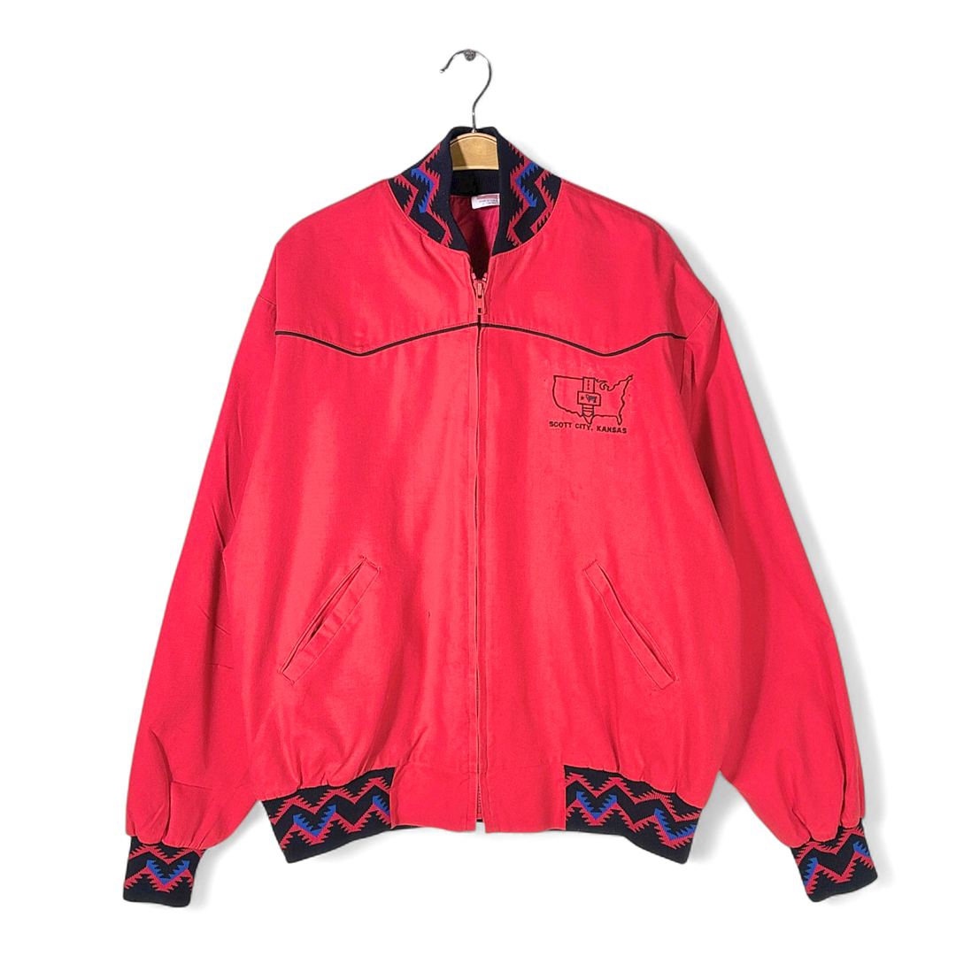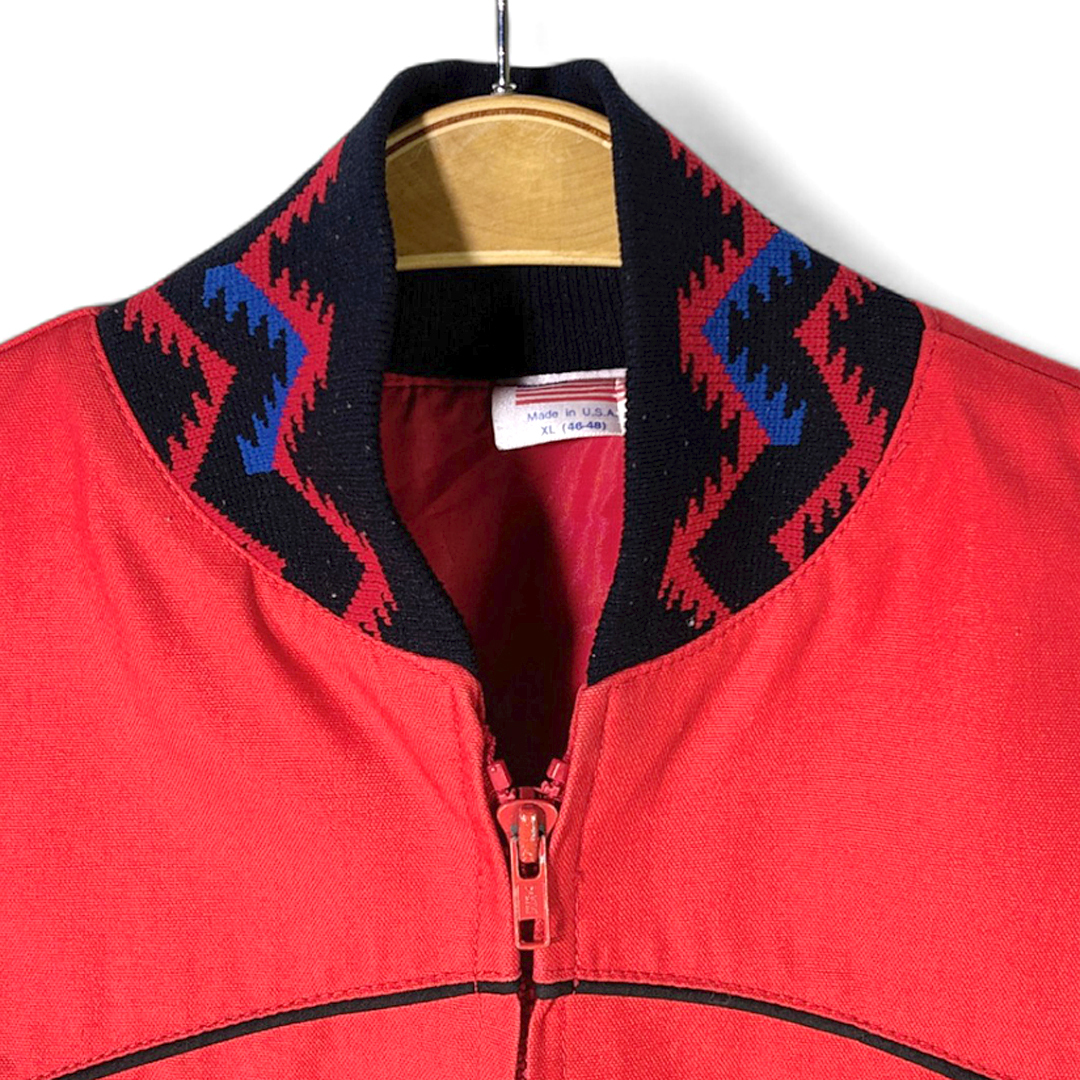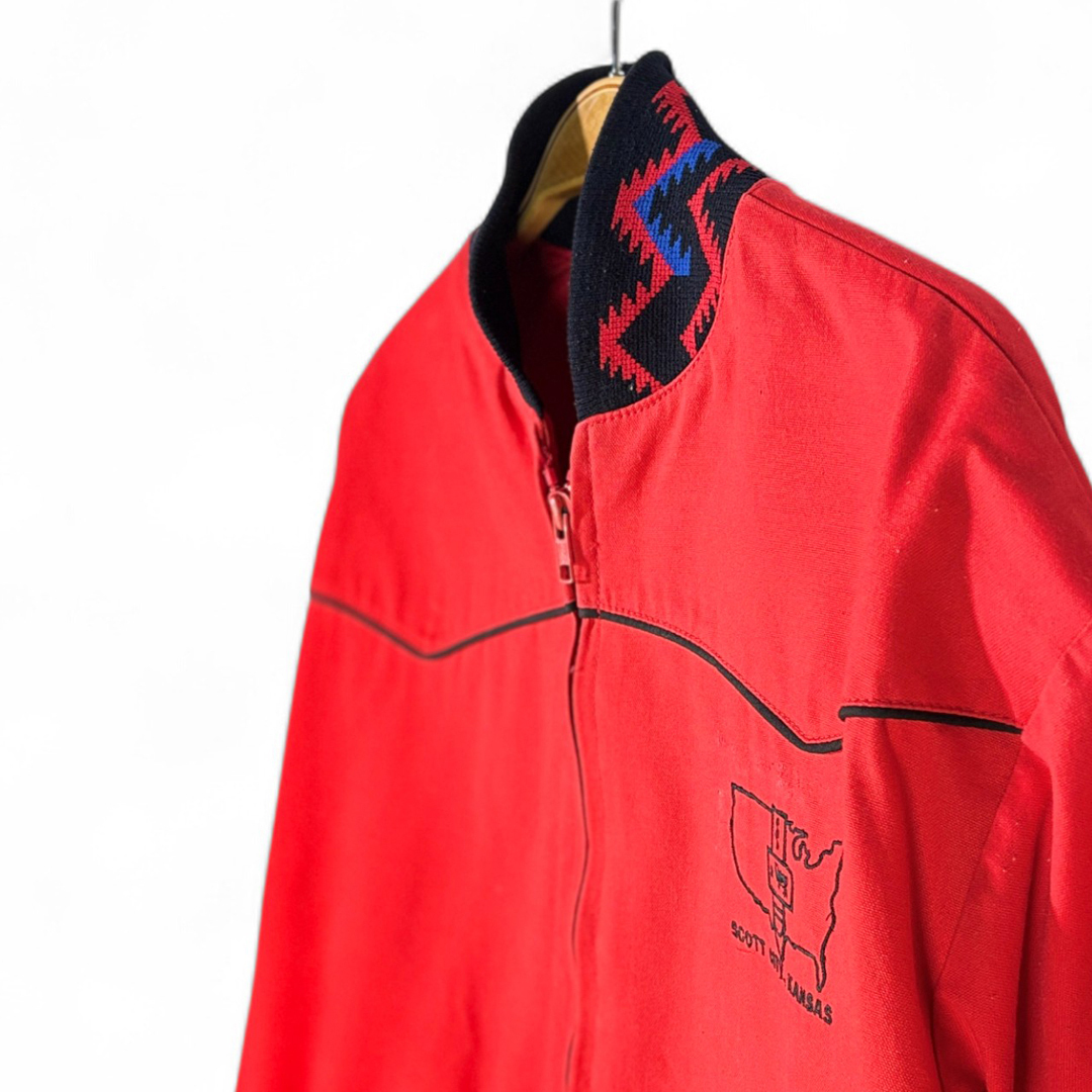 80s USA製 ヴィンテージコットンジャケット ウエスタン調 刺繍 ネイティブ柄 スコットシティ 赤 大きいサイズ XL 古着 DZ9045