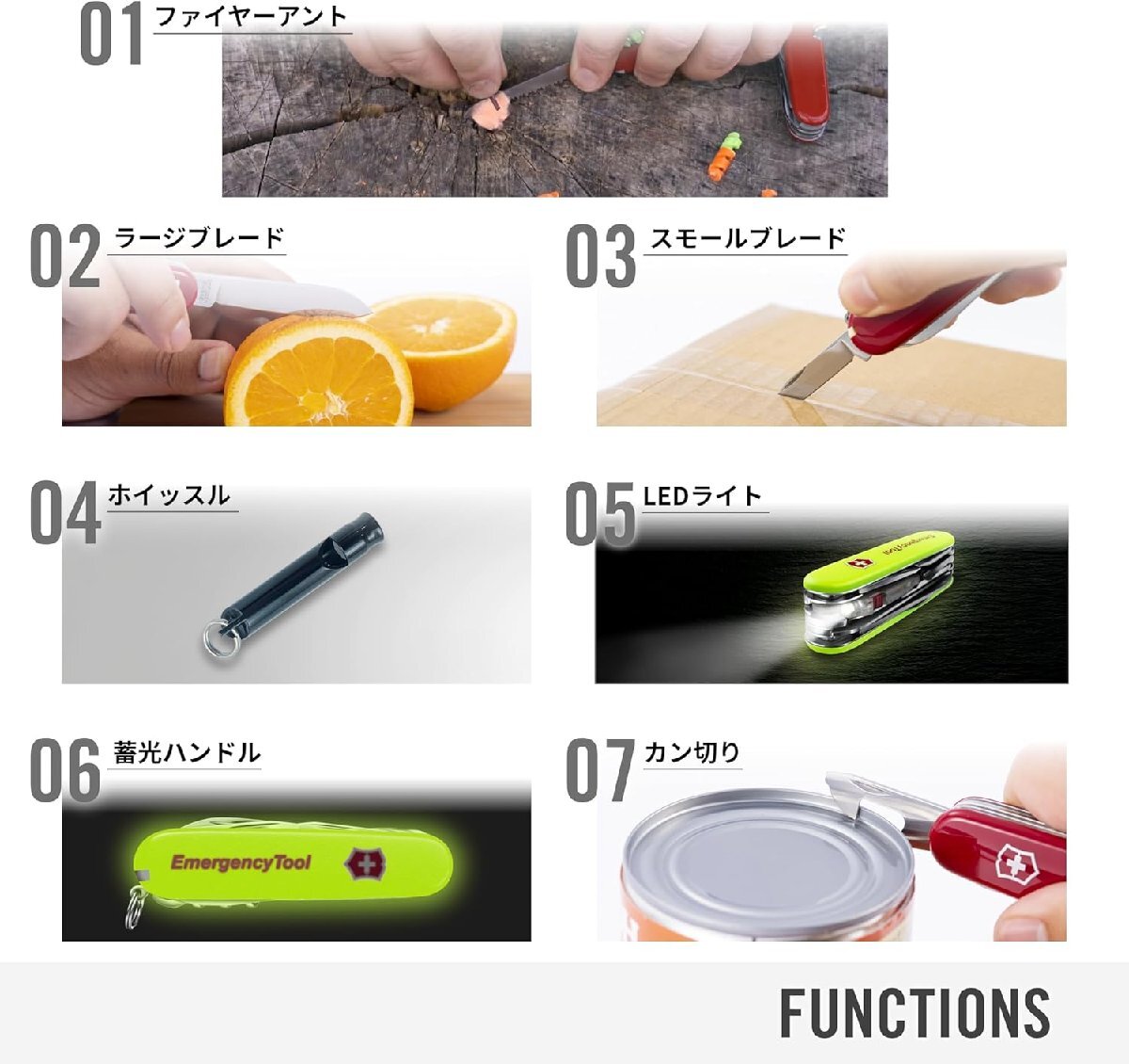 ラージブレード(大刃) / スモールブレード(小刃) / コルクせん抜き / ファイヤースチール / Helix Tinder / カン切り / マイナスドライバー 3mm / せん抜き / マイナスドライバー 6mm / ワイヤーストリッパー / マイナスドライバー 2.5mm / リーマー(穴あけ)、千枚通し / はさみ / のこぎり / プラスドライバー(フィリップス型1/2) / マルチフック / LED / キーリング / ピン / ピンセット / つまようじ / 加圧ボールペン