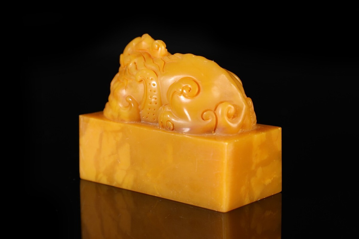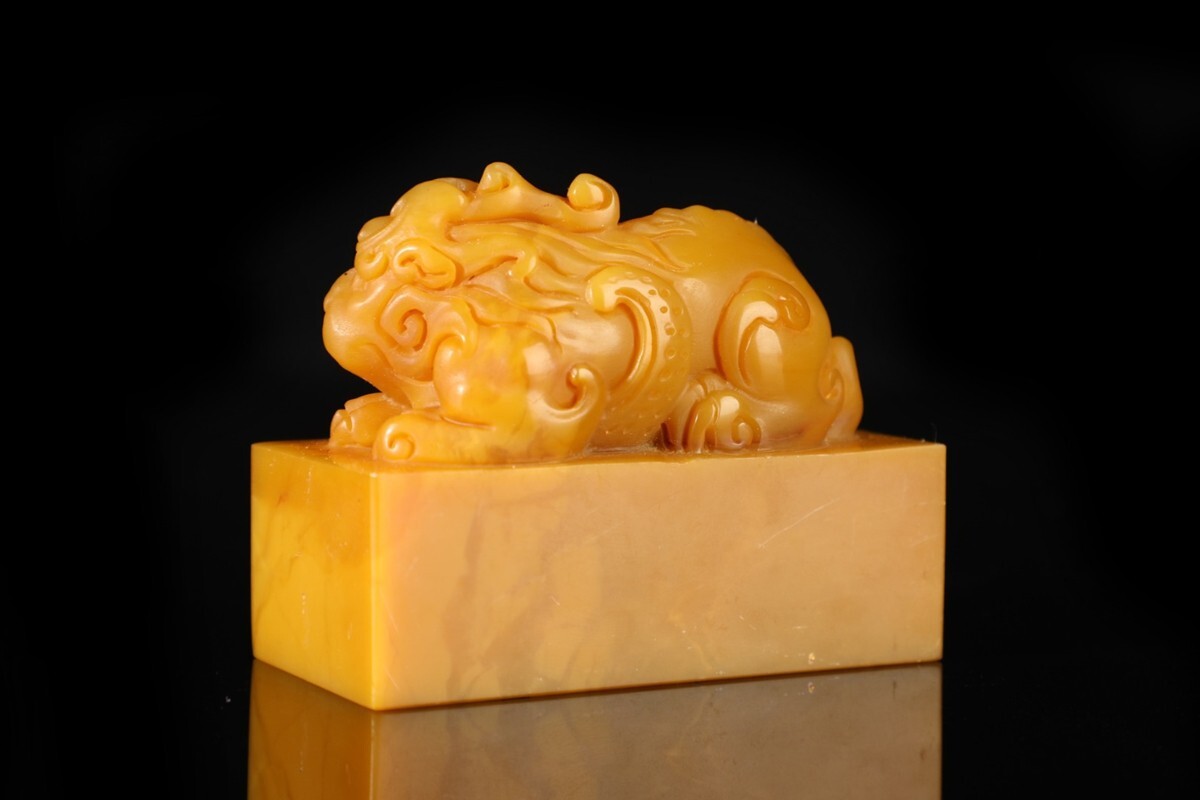 「清 乾隆庚戍年内務府監製 老寿山石 田黄石彫り 瑞獣鈕印章」極細工 擺件 古賞物 中国古美術 旧蔵出
