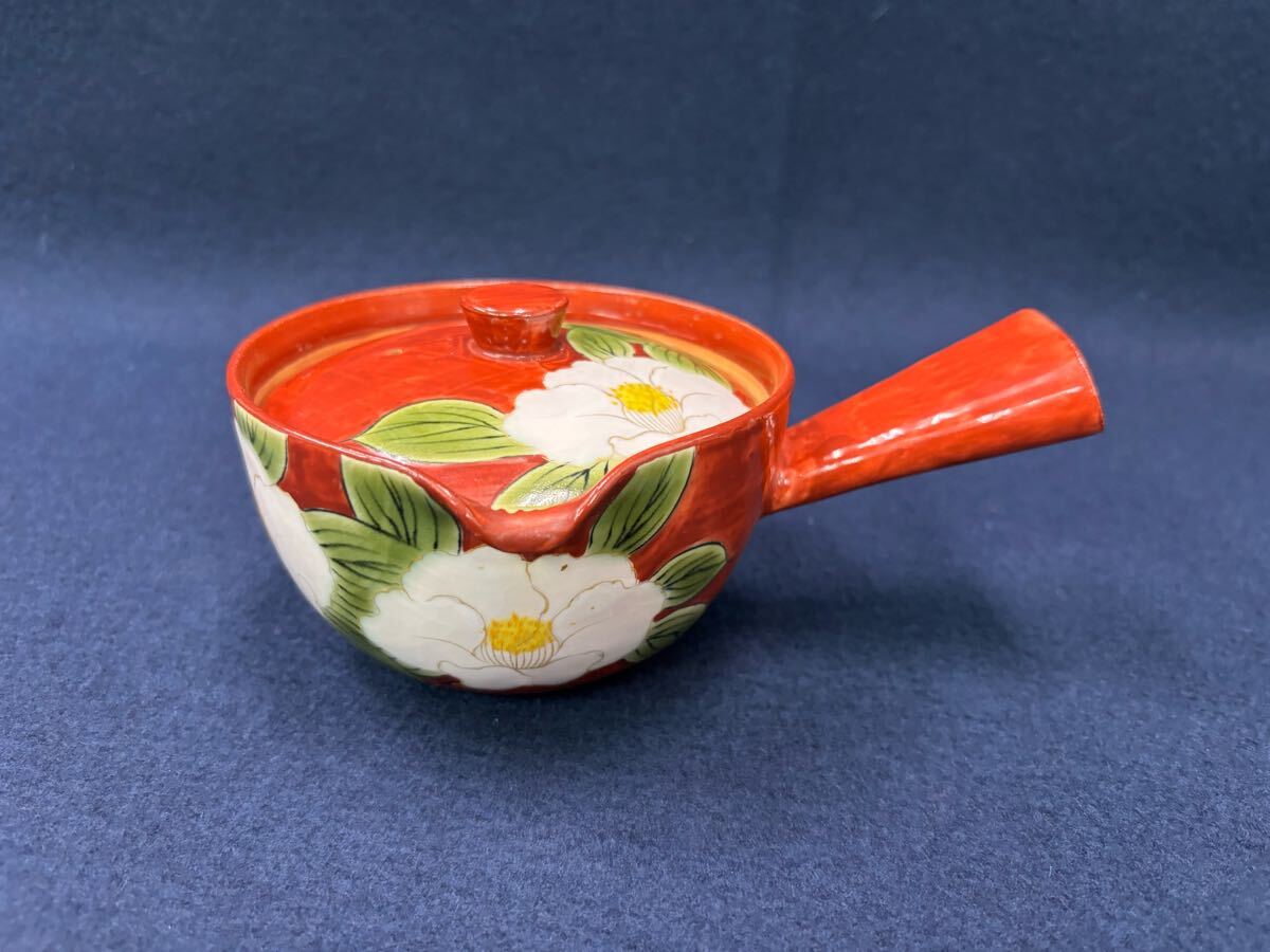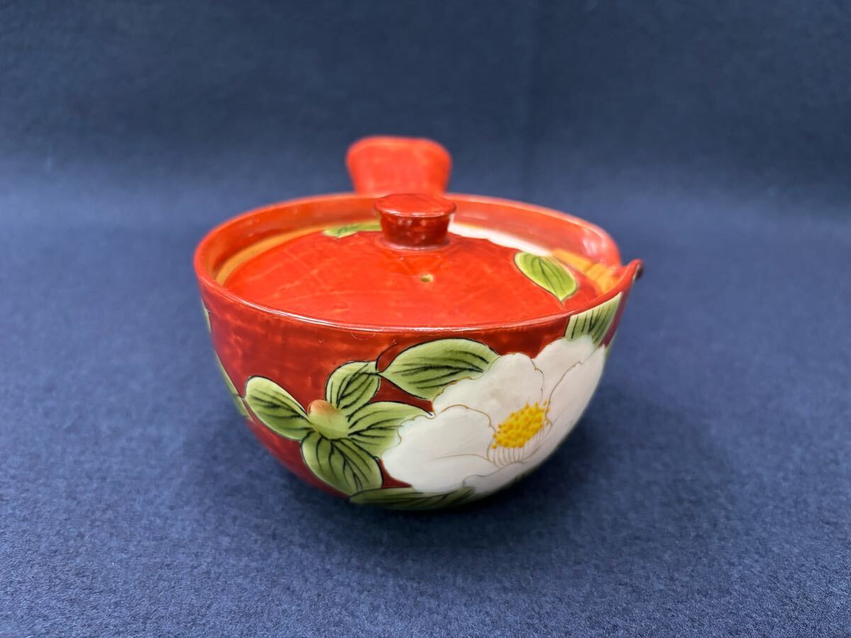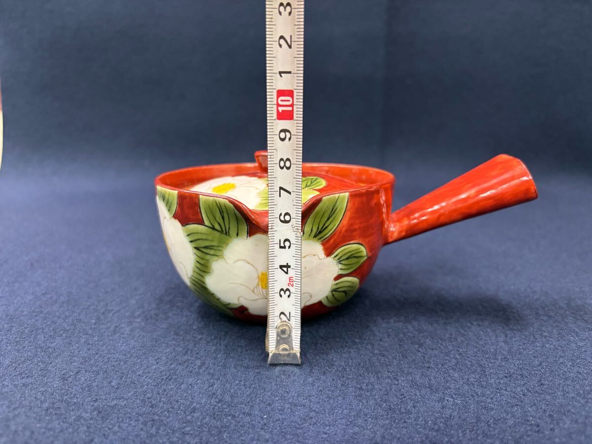 r7110112 京焼 清水焼 陶あん 作 赤地白椿 横手急須 煎茶道具 在銘