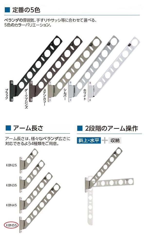 | 仕様 | 用途:腰壁取り付け用の物干し掛け 壁面からの出幅:使用時最大550mm/収納時92mm 耐荷重:30kg(1セットあたり) 取り付けに必要な道具:電動ドリル、プラスドライバー |