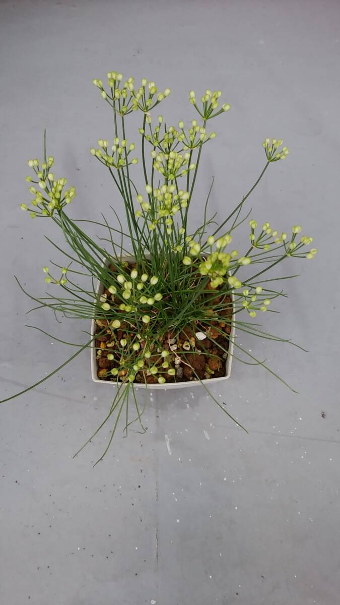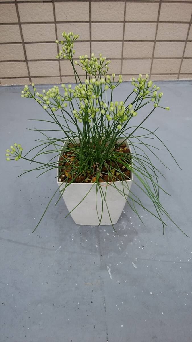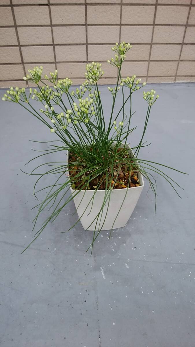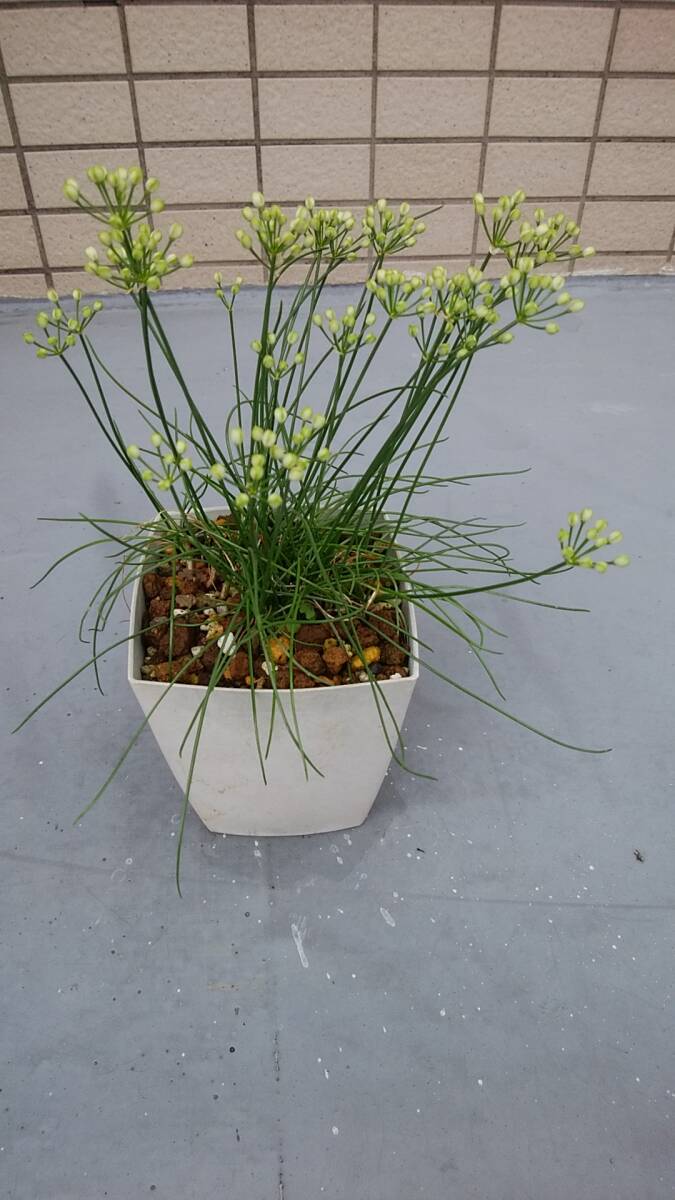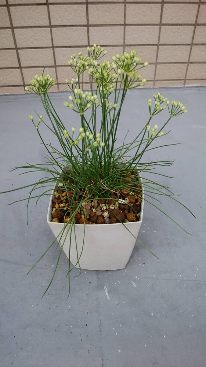 自宅で栽培している「白ラッキョウ」の鉢植えです。蕾が付いていて、白い花を間もなく咲かせるでしょう。現在の鉢全体の重さ約610g、鉢の大きさ11×10、草丈鉢底から約26cmです。