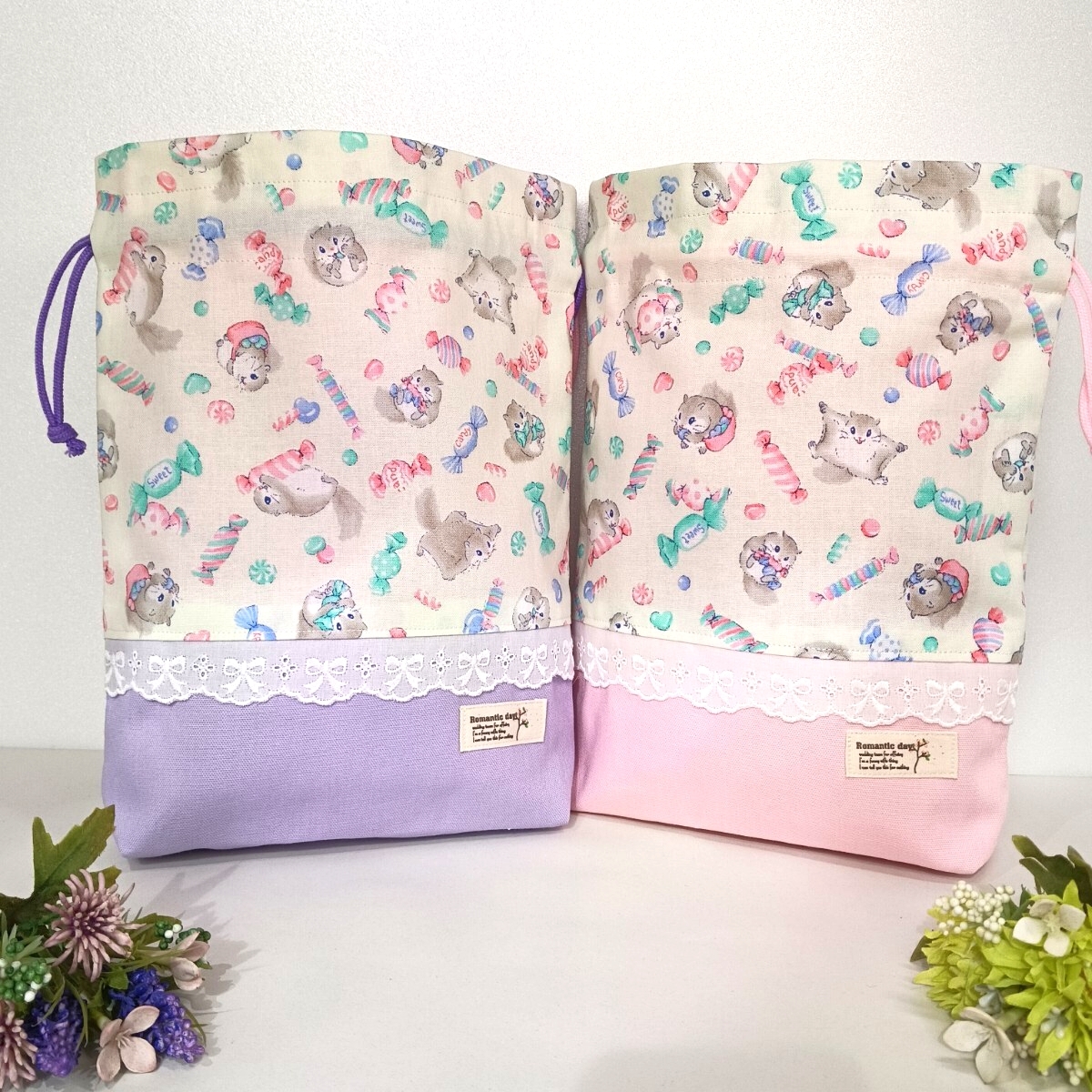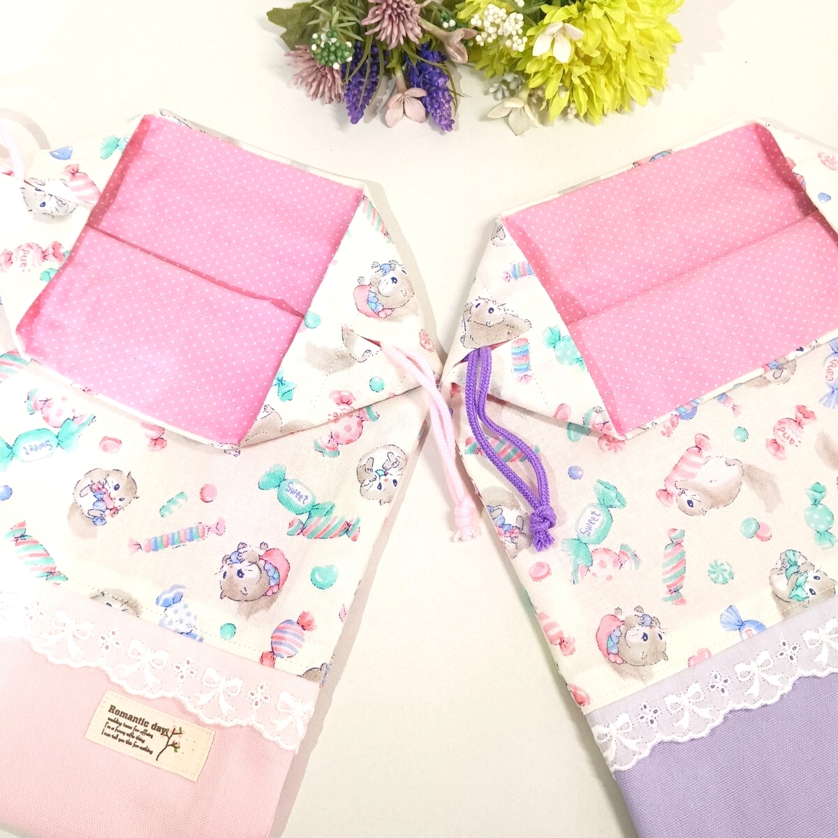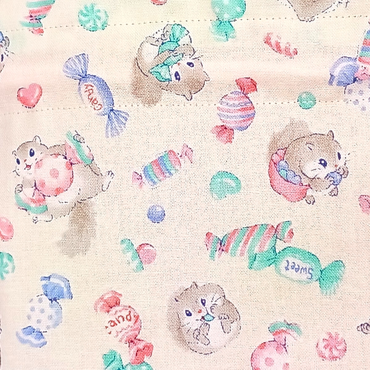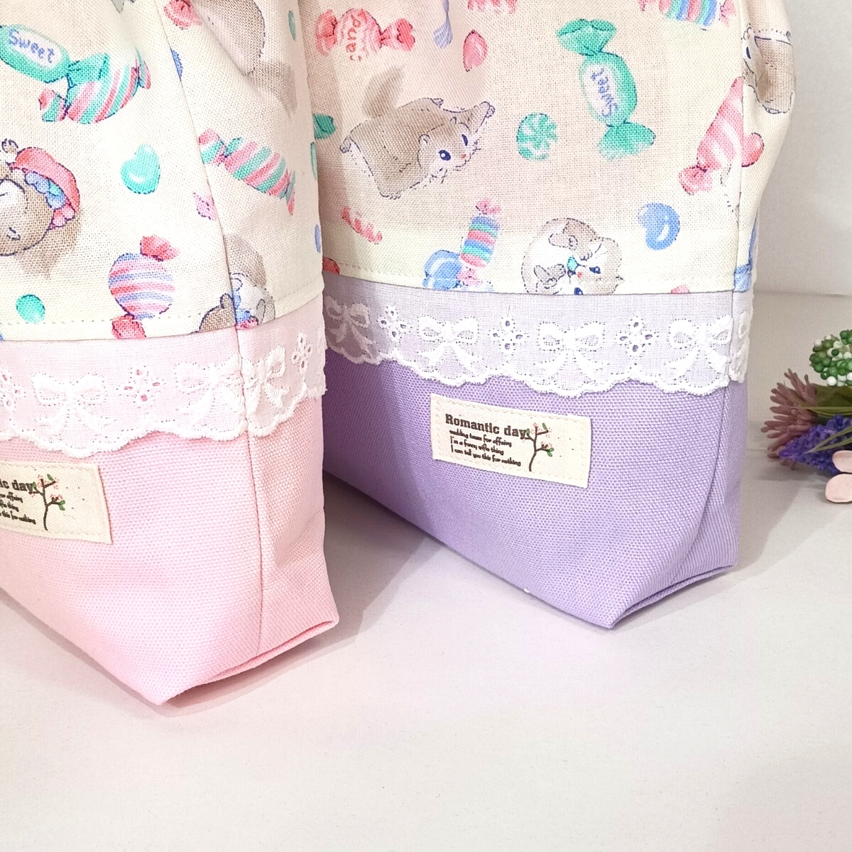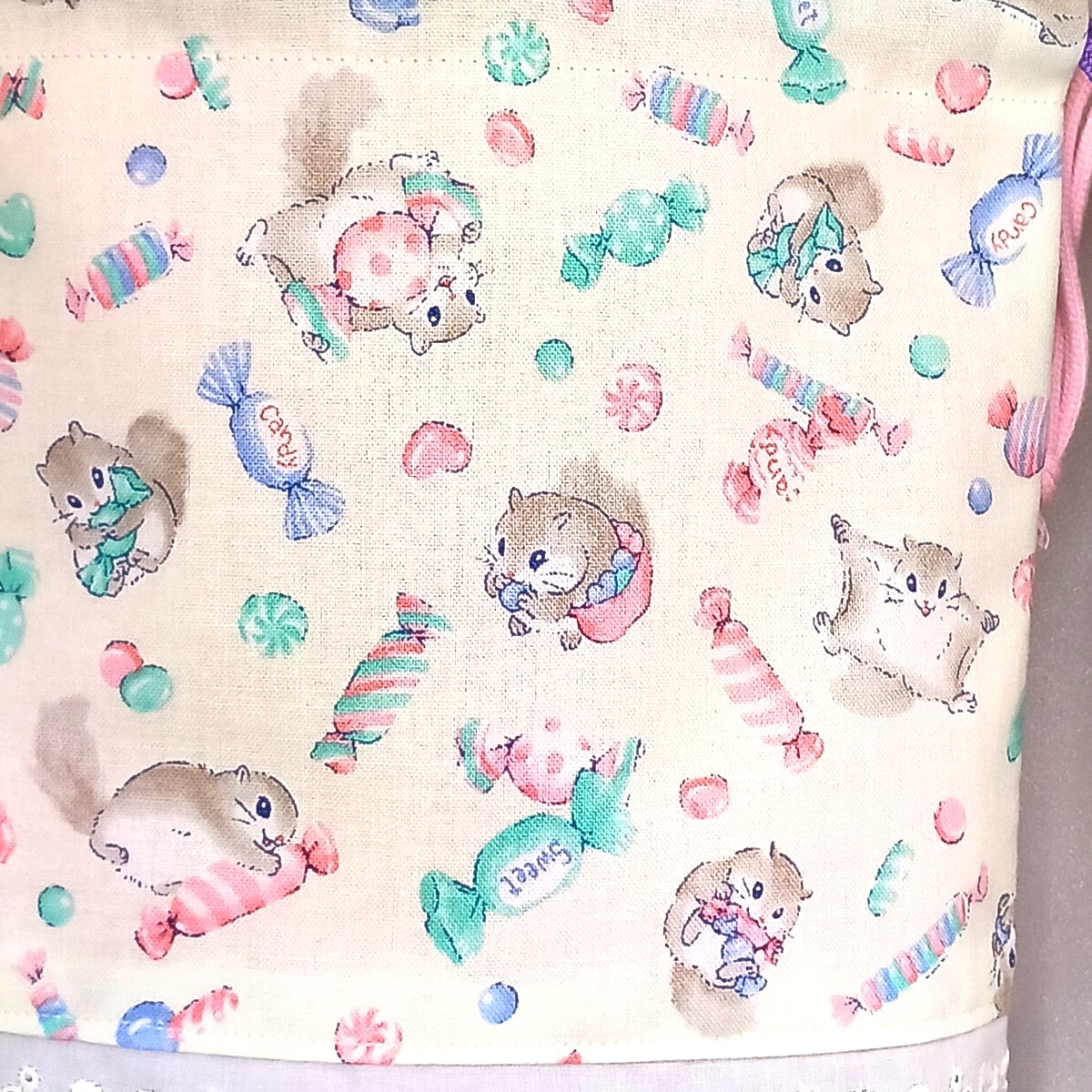表地は、モモンガとキャンディ柄に、ピンクとラベンダー色のオックス地で切り替え、コットンレースをつけました。