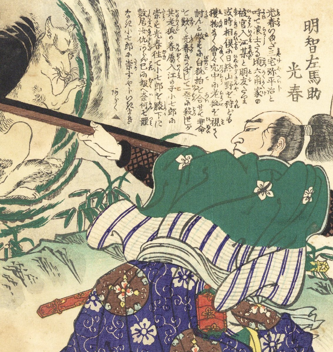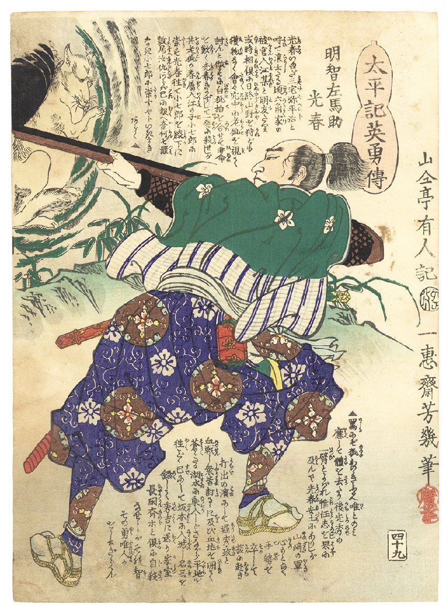 真作◆明智秀満【49】 明智光秀家臣 福知山城城代 芳幾「太平記英雄傳 明智左馬助光春 四十九」本物浮世絵版画 中判錦絵 Ukiyoe Yoshiiku
