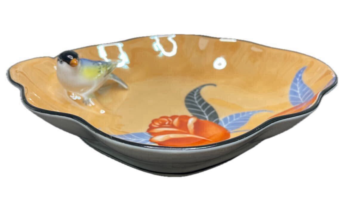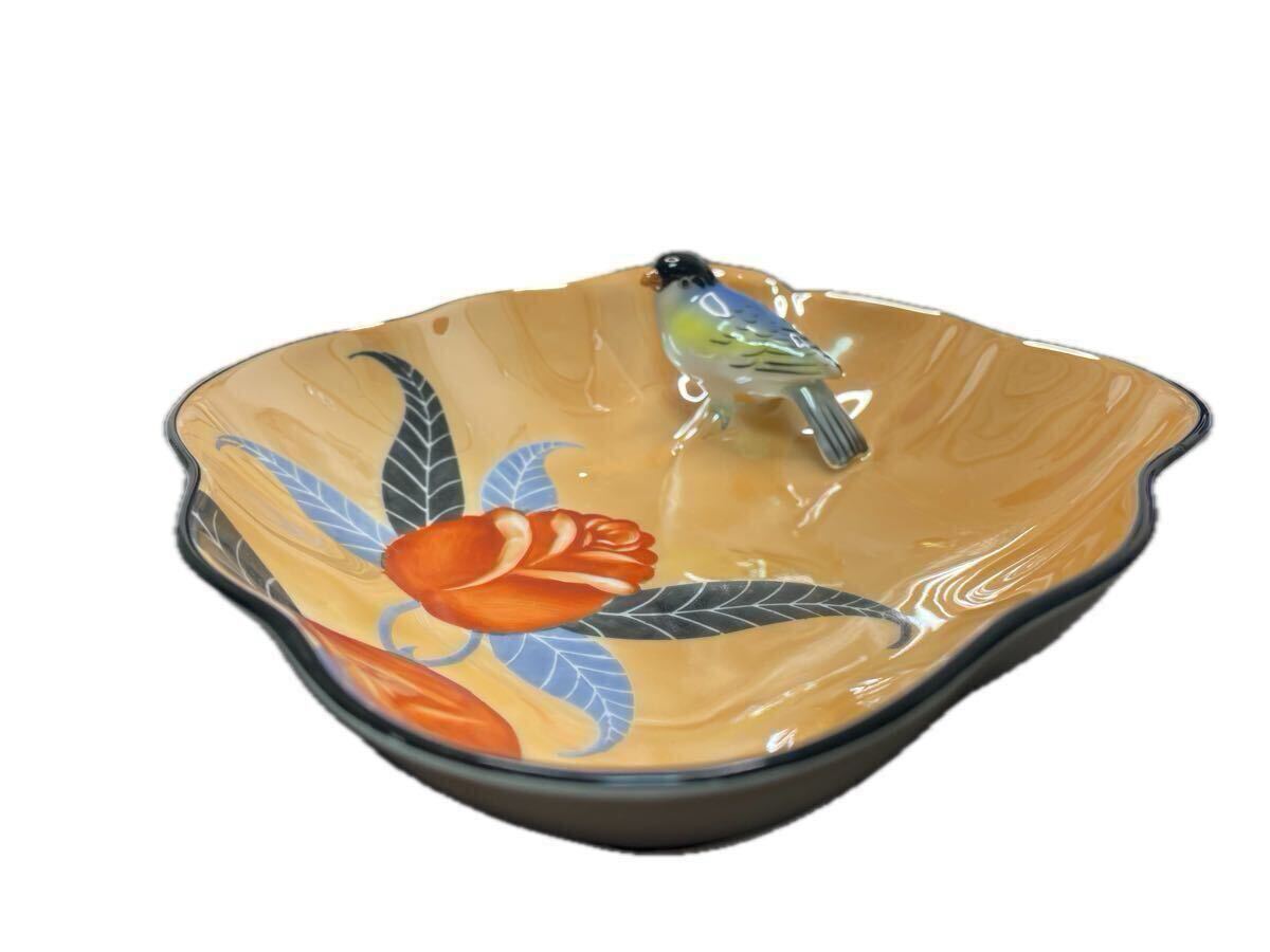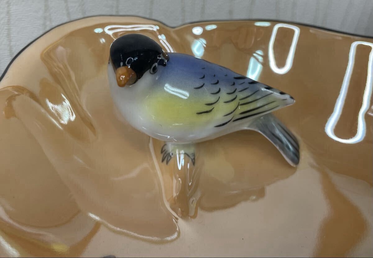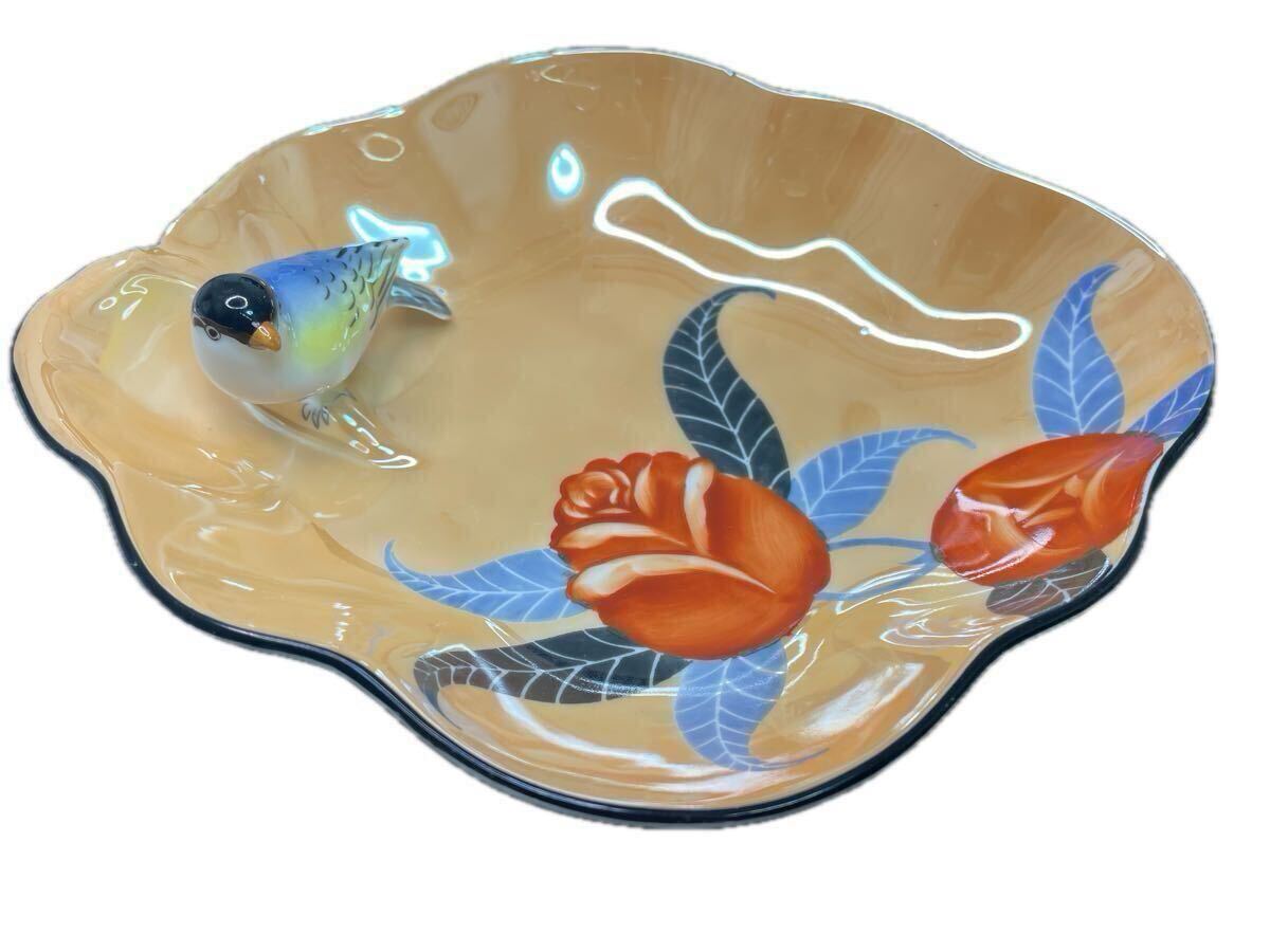 Feature: The main attraction is the highly detailed, dimensional porcelain bird figurine perched on the fluted edge of the dish. The bird features bright blue and black enameling.