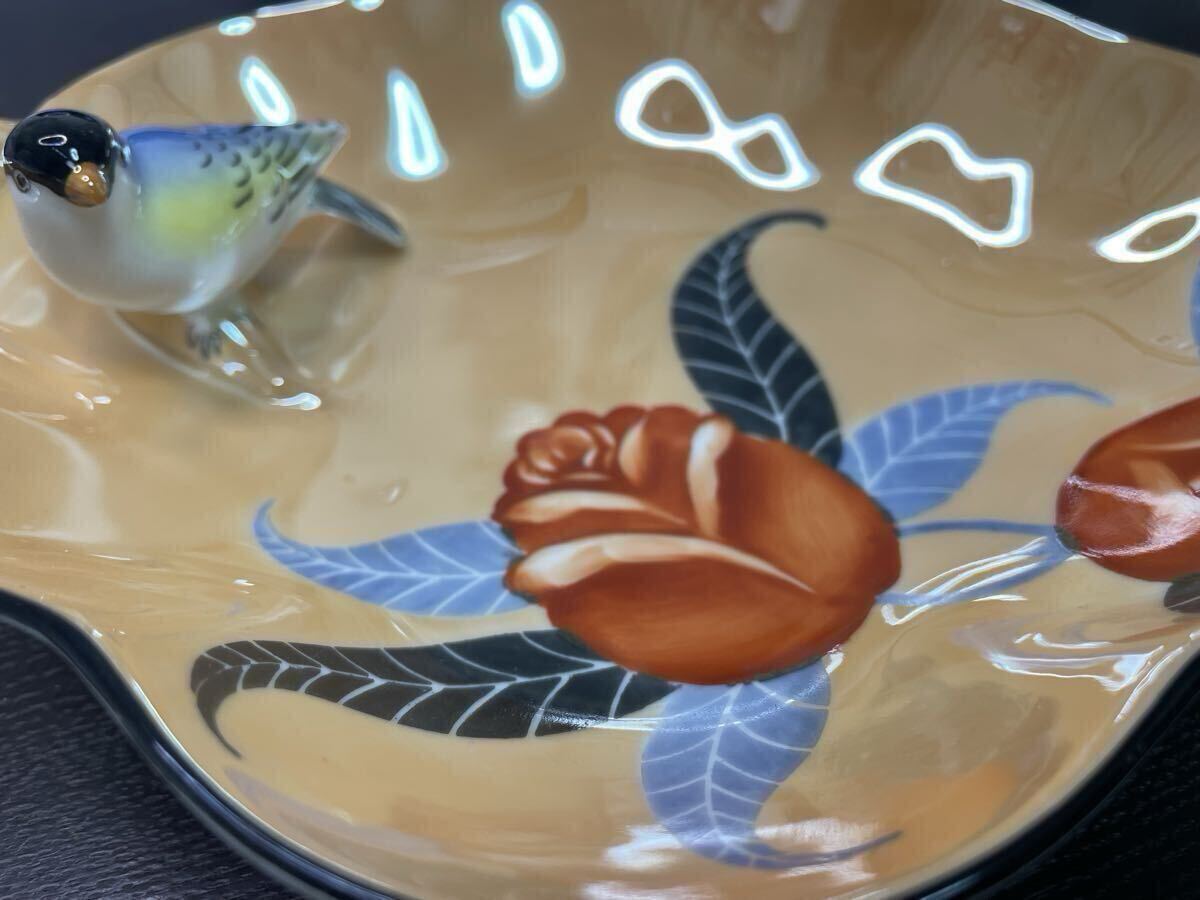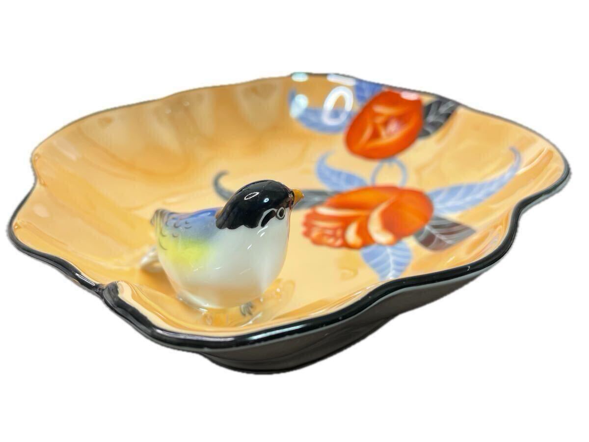 モチーフ: 器のフチに立体的な小鳥のフィギュアが据え付けられており、器の鮮やかなオレンジ色のラスター(ルスター)彩と、鳥の青や黒の彩色が美しいコントラストを織りなしています。