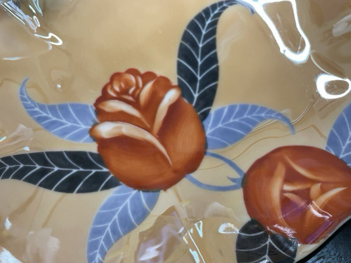 デザイン: 器には、オレンジや青が基調となった大胆な花と葉のハンドペイントが施されており、アール・デコらしいモダンなデザインです。