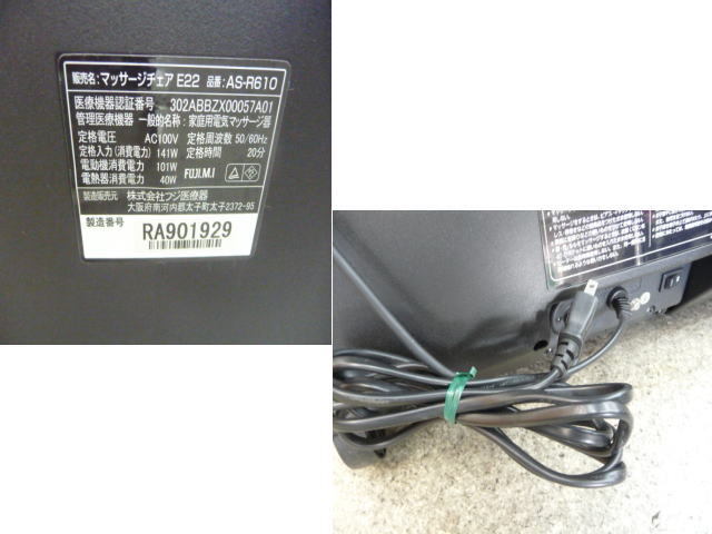 | こちらの商品は中古品です 動作確認済です 電源につなぎ、リクライニング動作、モミ玉、エア動作など一通り動作確認をいたしました。 特に問題はありませんでした レザーの箇所に破れなどは見られないとは思いますが スレなどが見られる場合もございますので 神経質な方のご入札はご遠慮ください 2022年製 肩をしっかりつかみほぐすことを追求し開発した独自のつかみ機構 「GRIP式メカ4.0」を採用。 6つのもみ玉が部位ごとに多彩なもみ心地を実現。 「360°回転もみ玉」や「S字フィットフレーム」で身体に沿って流れるようにマッサージします。 GRIP式メカ4.0のつかみ動作 肩は手でつかむように上下から挟み込みます。 横回転に加えて縦回転もできるもみ玉を採用。身体に沿って流れるようなマッサージを体感できます。 6つのもみ玉のうち、最上部2つに搭載 ●背すじの曲線に沿った「S字フィットフレーム」 首・肩・背中・腰の曲線に沿って身体にフィットしたもみ心地を実現 ●肩位置自動検出&プログラムフィードバック 身長や体形に応じて適切なマッサージポイントを予測しマッサージを行います。 定格電源(50/60Hz)AC100V 定格時間20分 定格入力(消費電力)(50/60Hz)141W(ヒーターのみ40W) 待機電力8W メカ(もみ玉)マッサージ速さ調節範囲もみ:約18回/分 たたき:遅 約300回/分 速 約400回/分 上下移動:1.26cm/秒 エアーマッサージ空気圧80kPa以下 メカ(もみ玉)マッサージ強さ調節範囲肩:5段階調節 背:2段階調節 腰:5段階調節 エアーマッサージ強さ調節範囲3段階調節 肩位置調節7段階調節 オートタイマー約15分 リクライニング角度約118度~約150度 張り地PVCレザー 本体寸法 通常(約)幅70×奥行107×高さ107cm肩部を上げ、脚部収納時 本体寸法 リクライニング時(約)幅70×奥行181×高さ83cm肩部を上げ、脚部最大使用時 本体質量(約)61kg ※返品返金は対応不可 2022年7月からヤフオクのシステム変更に伴い 落札後に電話番号が表示されなくなりましたが、 アートセッティングデリバリー(旧:クロネコヤマトのらくらく家財宅急便)では 発送先の電話番号は必須項目となりますので 落札後に取引メッセージ欄より必ず電話番号をお伝えください 配送は上記を予定しておりますが直接店頭でのお渡しも可能です ※落札後に取引メッセージにてお伝えください※ ■千葉県千葉市■営業時間 9:00~19:00■第3火曜/水曜定休日■ 注意事項 悪い評価が多い方のご入札は取り消しさせていただきますのでご了承下さい(特に落札者都合によりキャンセルが多い方) ★ご質問について★ 記載済みや終了間際のご質問お答えできない場合があります。 また送料は料金表もしくは別ページにてご案内しておりますので個別にお答えはしかねます。 ★保証について★ 到着予定日から7日間以内の初期動作不良は返品等お受けいたします。 また作動確認などにかかった費用や作動不良のために生じた損失などは保証出来ません。 尚、落札者様のご都合により期間内に動作確認できず7日を過ぎた場合は保証いたしかねますのでご了承下さい。 またジャンク品、ノークレーム・ノーリターンの記載がある場合は該当しません。 ★返品について★ 初期不良を除き買い間違い、サイズ違いによる返品はお受けできません。 新品の場合は開封・使用後の返品はお受けできません またジャンク品、ノークレーム・ノーリターンの記載がある場合は該当しません。 ★連絡などについて★ オークション終了後3日以内にご連絡が無い場合は落札を取り消しさせていただきますのでご了承下さい。またオークション終了後7日以上経ち入金確認できない場合も同様とさせていただきます。 夜8時以降に終了したオークションのご連絡は翌日の午前中になります。 上記の内容をご了承の上ご入札下さい。 | |||