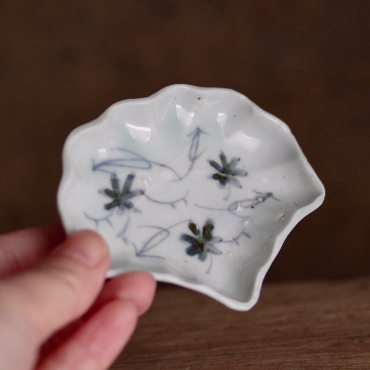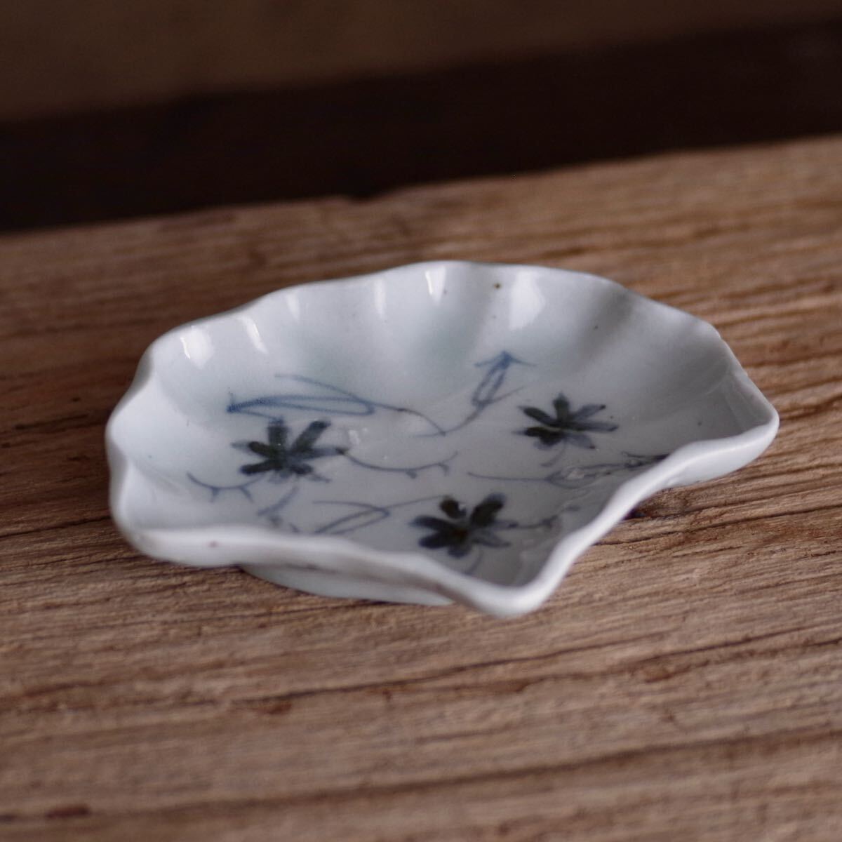 あまり見かけない、楓と折れ松葉が舞う銀杏型の変形皿でございます。可愛らしい豆皿ほどの小品で、江戸中期から後期頃の作と見ております。高台まわりにも時代を映す丁寧さと味わいがあり、小さいながらもたいへん良い出来映えです。銀杏型のかたちと絵付けが調和し、小さな中にも豊かな秋の景色をたたえています。