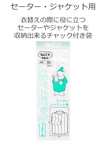 説明 ●衣替えの際に役に立つセーターやジャケットを収納出来るチャック付き袋です。 ●旅行の際のパッキングなどでも活躍する袋です。 ご使用上の注意 ●焼却しても有害ガスが発生しません。 ●この袋は幼児や子供にとって窒息などの危険が伴うものです。幼児や子供の手の届かない所に保管して下さい。 ●突起のあるものを入れると材質上破れることがありますのでご注意下さい。 ●火のそばに置かないで下さい。