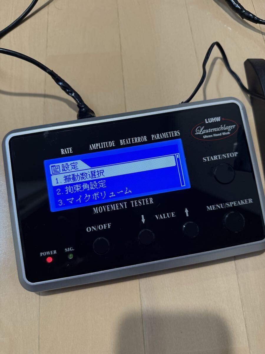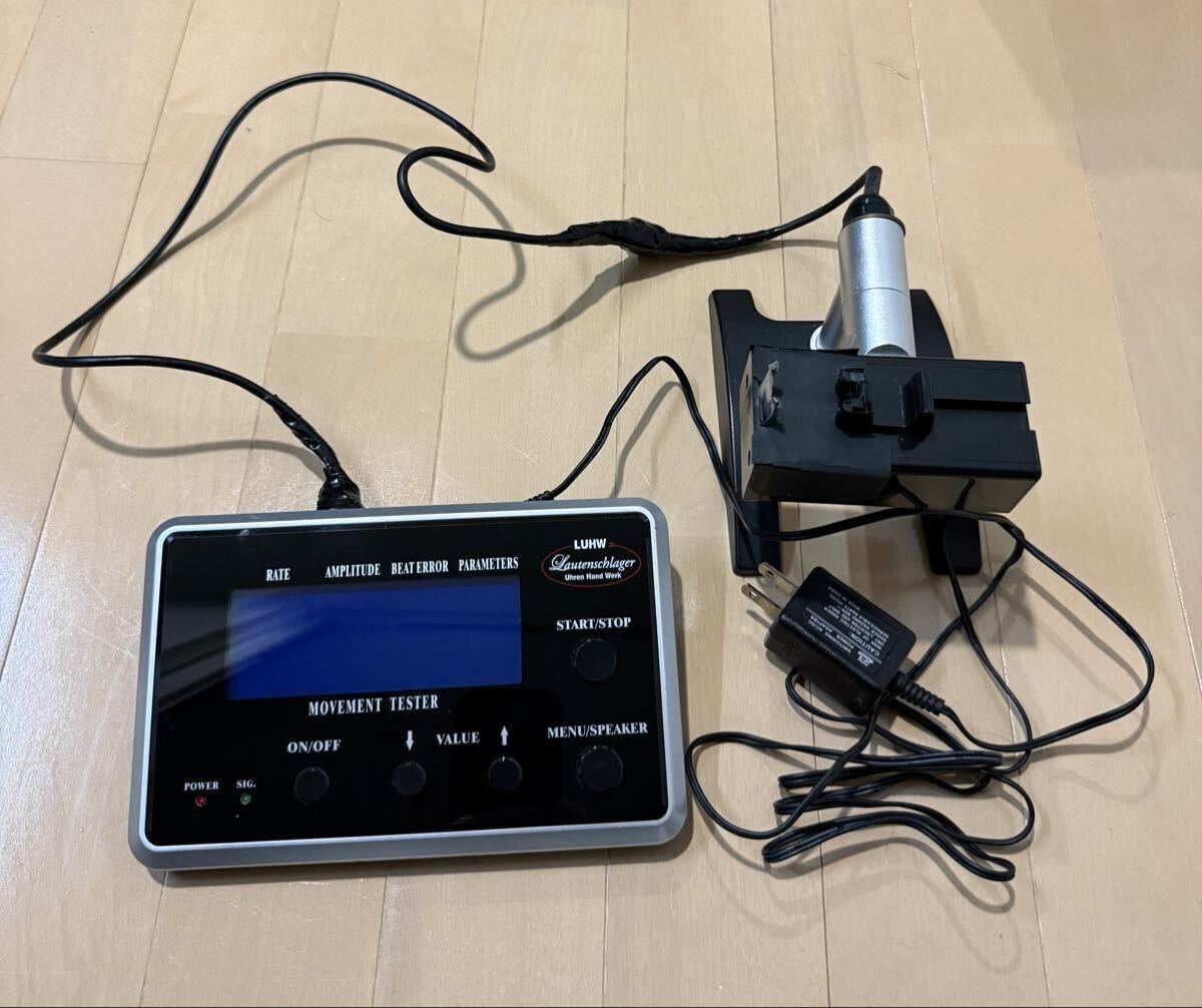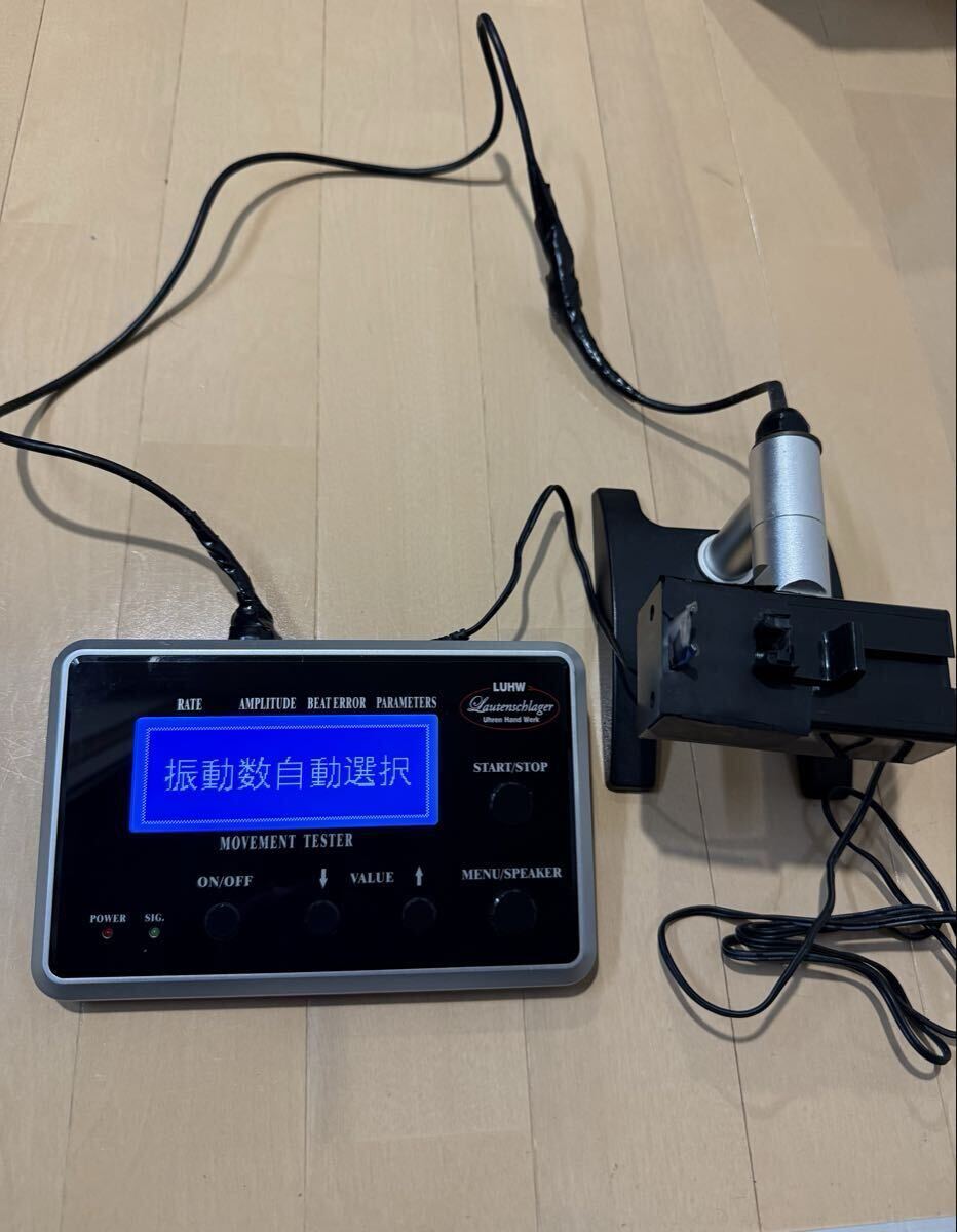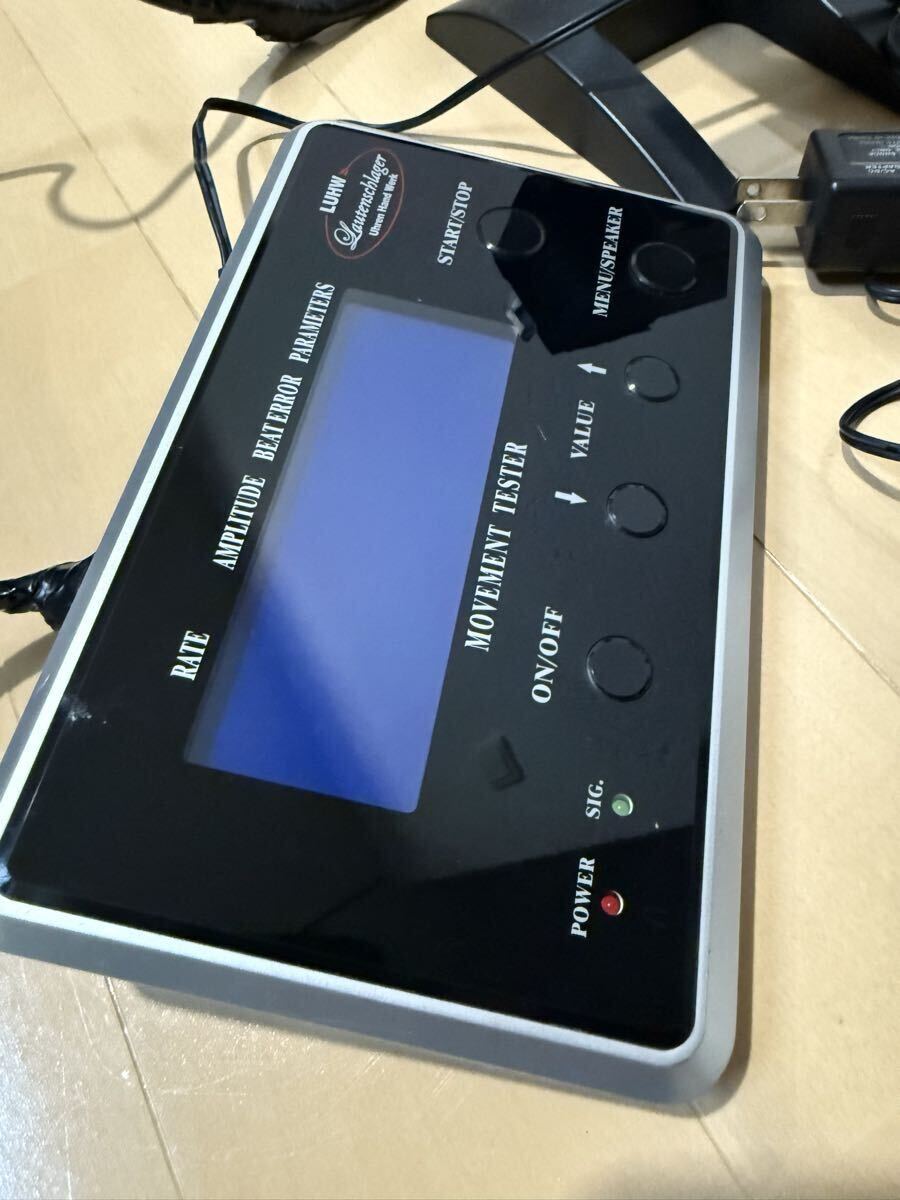 ローテンシュラガー 自動巻き時計測定器 タイムグラファー 中古品になります。写真の通り本体と測定器とアダプターの出品になります。写真の中の時計は付属致しません。時計を測定している参考写真となります。現状は稼動品で自動巻き、手巻き測定可能です。訳ありですが測定器のケーブルが修理してあります。特に使用には差し支え無い状態ですが気にされます方はご遠慮ください。また現状は動作確認済みなんですが精密機械及び訳あり品なので到着後も動作を保証することは出来かねます。あくまでも中古品なので修理をしたり出来る方は大丈夫かと思いますが新品の動作保証をお考えの方はご遠慮下さい。ノークレームノーリターンとさせて頂きます。