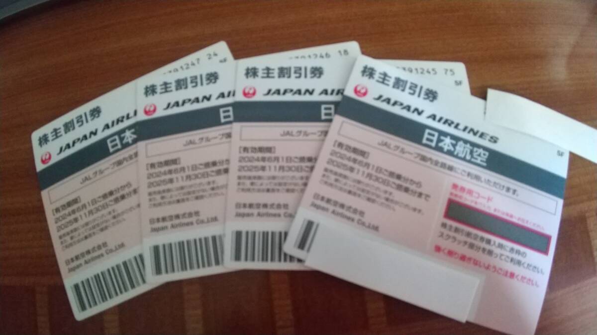 JAL優待券4枚セットです。有効期間は、2025年11月30日ご搭乗分までです。取引ナビでコード通知でも可能。券だけおくることも可能です。