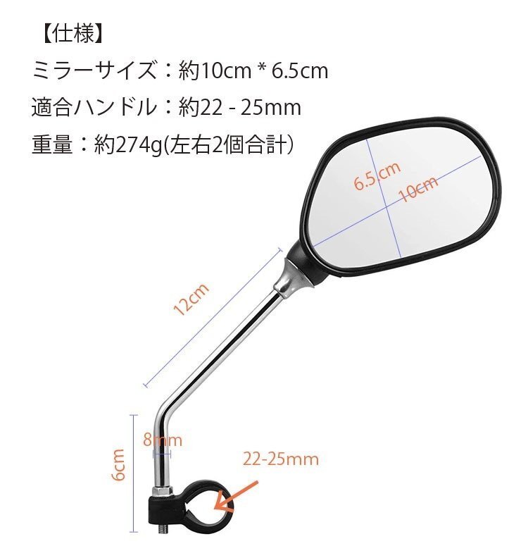 自転車のハンドルバーやバーエンドなどに取り付けできるバックミラー左右セットです。