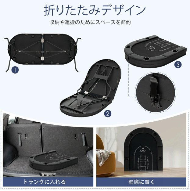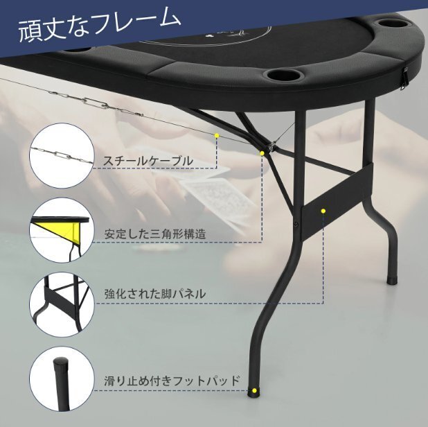 ポーカーテーブル 8人用 折りたたみ ポーカーマット 麻雀卓 完成品 幅182x奥行82x高さ75cm 楕円形 持ち運び可能 組み立て不要 ブラック