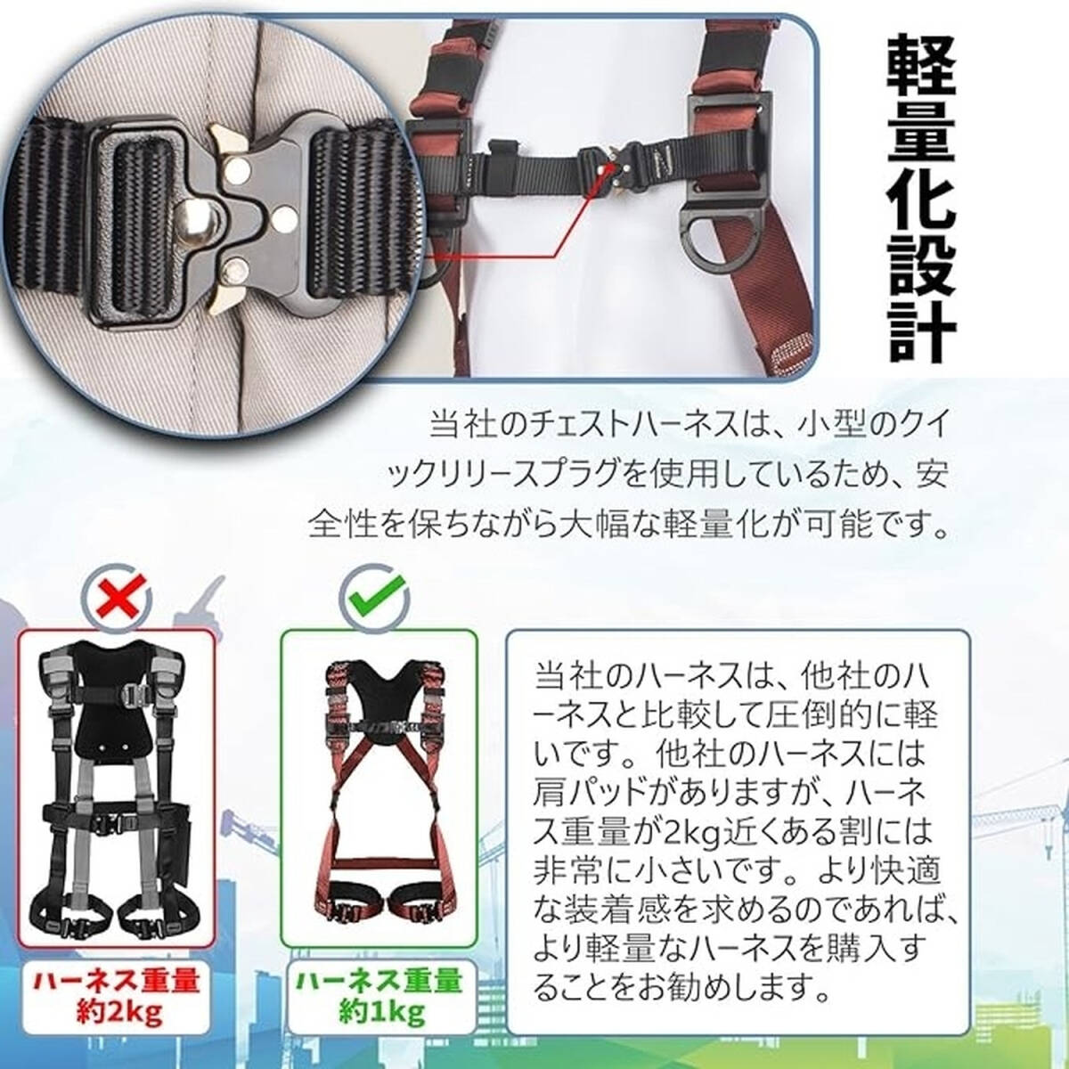 ハーネスの重量は約1.1kg、身長に適しています:150cm〜185cm(高さ調整が可能である)、太もも周囲:45cm〜90cm、最大耐荷重:100kg。