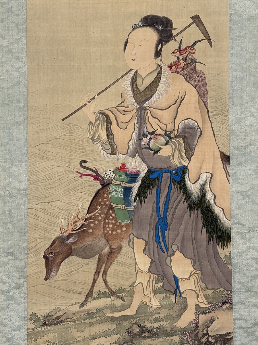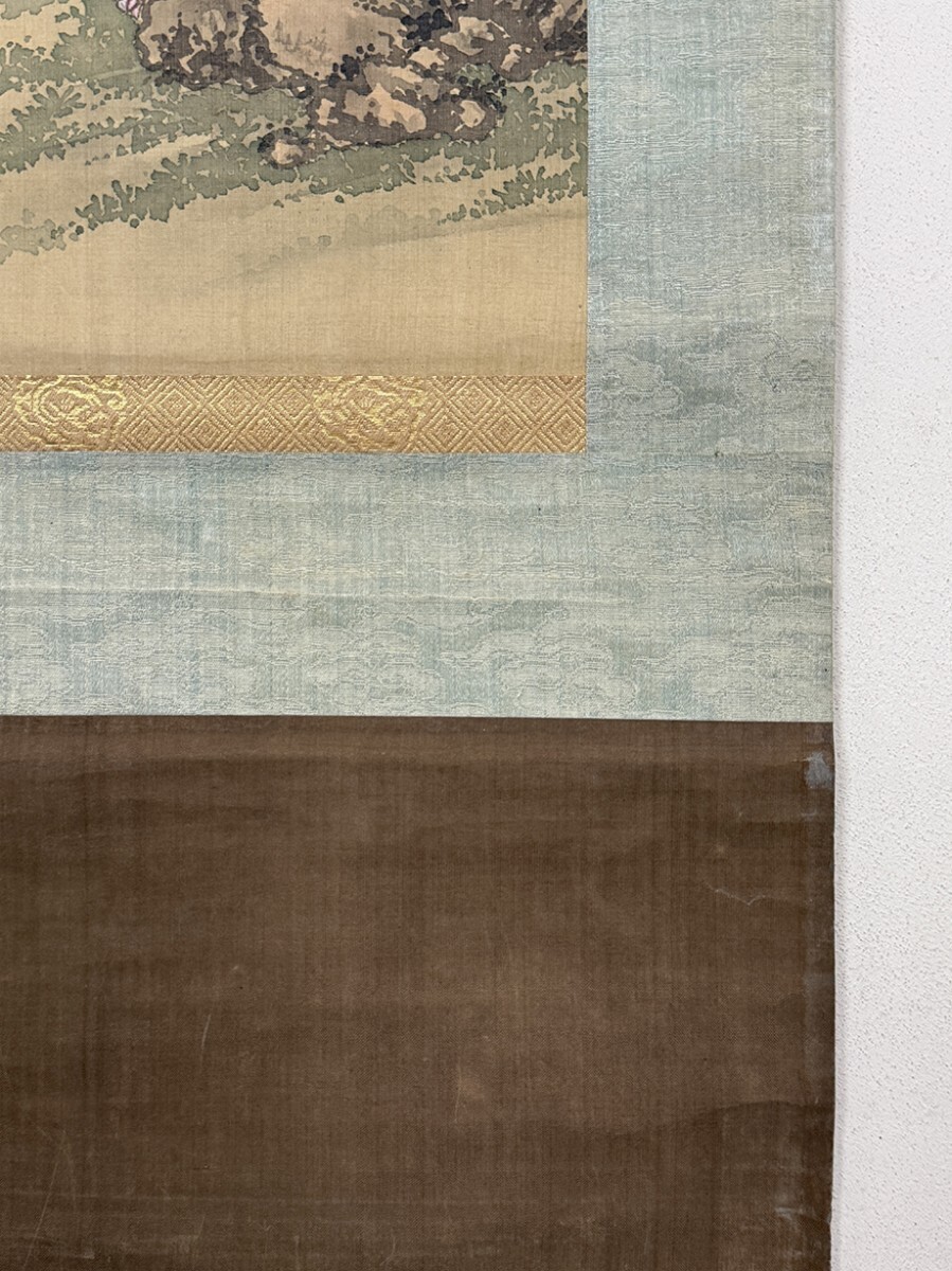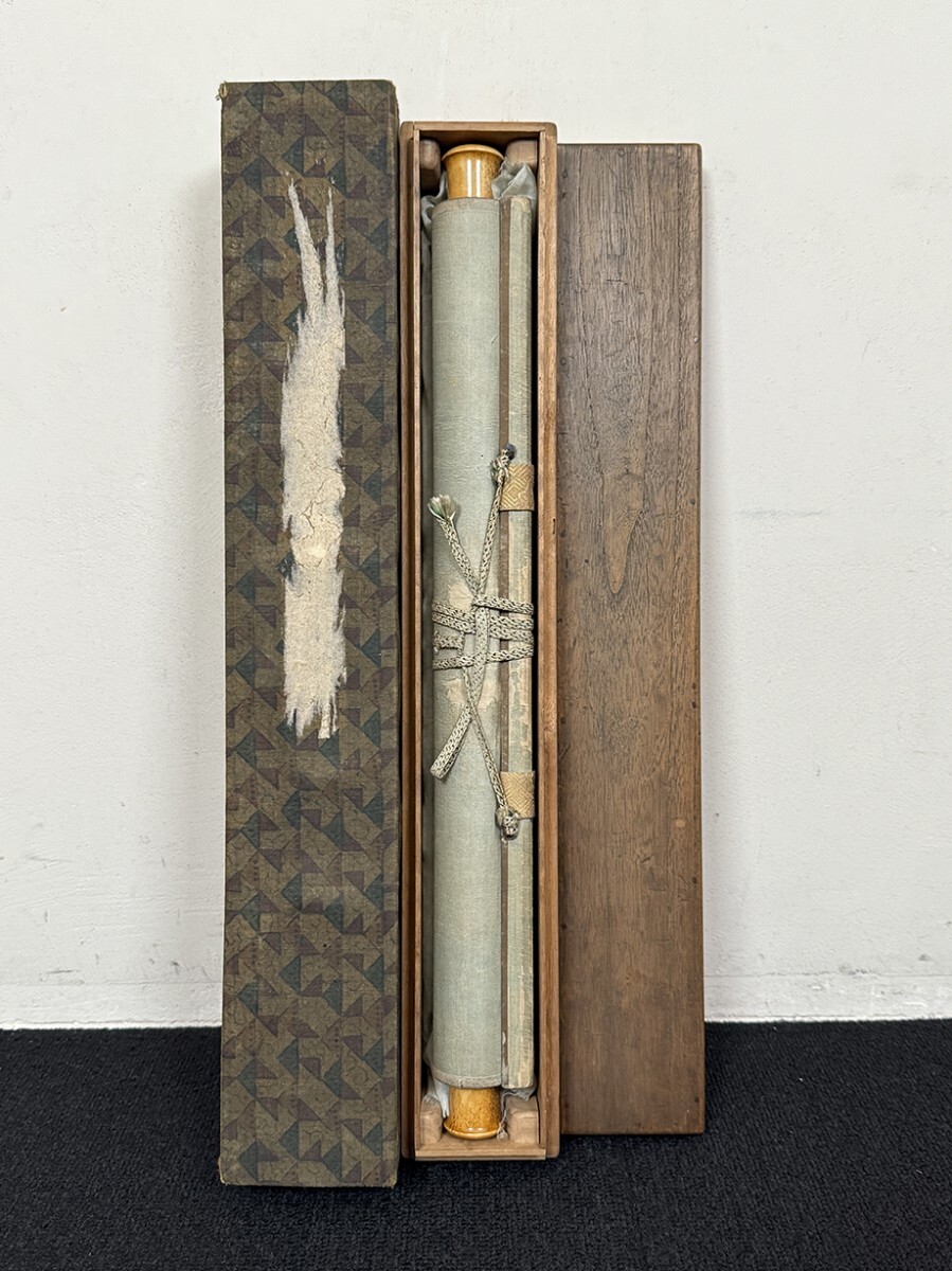 総丈サイズ…横 41 × 縦 181 cm 絹本着色金泥・箱入 状態…表具少傷ミ・微少ヤケ 本紙微少シミ・微少オレ 【印刷ではありません】 【真作】 蠣崎波響 江戸後期の絵師。名は広年、字は世祐、将監と称す。別号に杏雨。松前藩12代藩主松前資広の五男。13代藩主道広は異母兄。家老蠣崎広武の養子となり、江戸の藩邸で建部綾足や宋紫石に画技を学んだ。のち大原呑響の強い影響を受け、円山応挙に入門した。松前家が陸奥国伊達郡梁川藩に転封されると、家老として藩主の松前復帰に努めるとともに、創作活動を充実させた。代表作に『夷酋列像』など。文政9年(1826)歿、63歳。 |