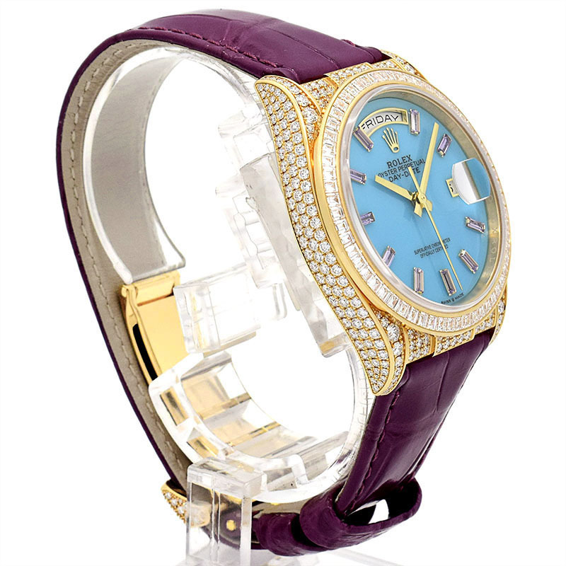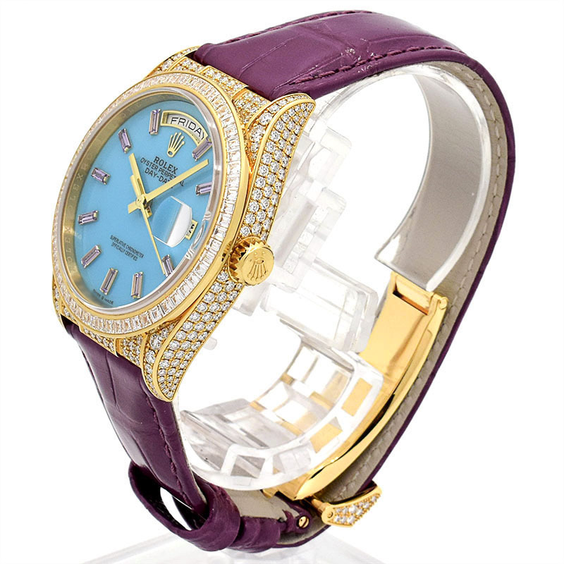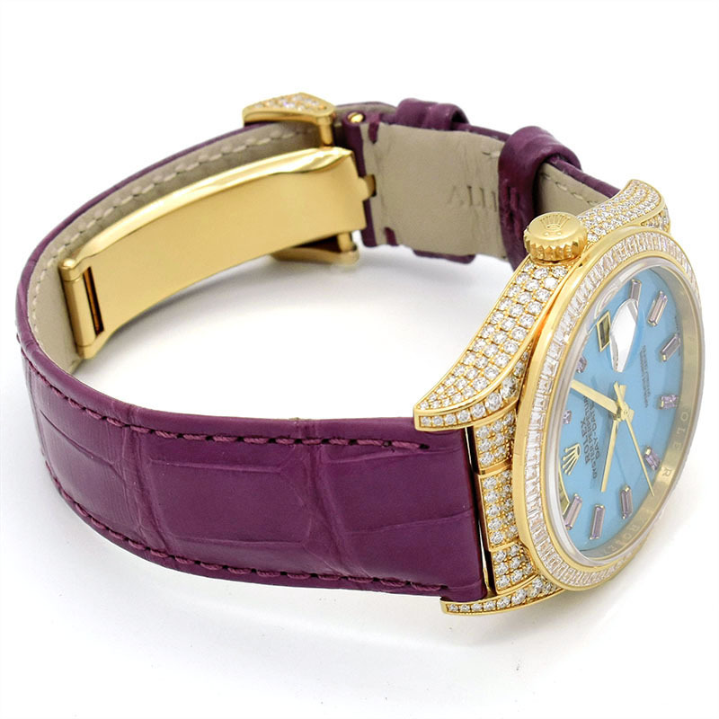 | 店長メモ | 18Kイエローゴールド製ケースに精緻なバゲットカットサファイアとパヴェダイヤモンドを贅沢にセットした、究極のラグジュアリーウォッチです。 ターコイズブルーの文字盤が希少モデルとしての価値を更に高め、袖口で圧倒的な存在感を放つ一本です。 |
