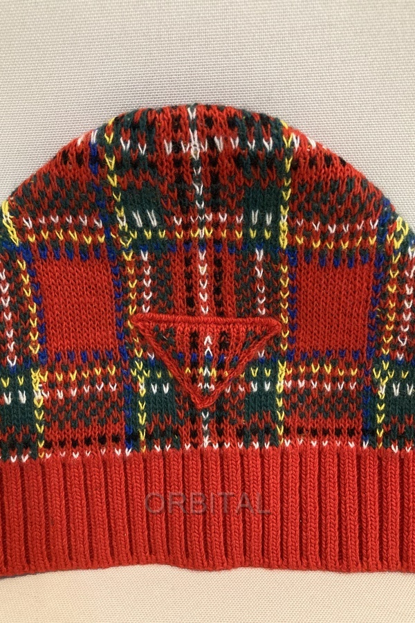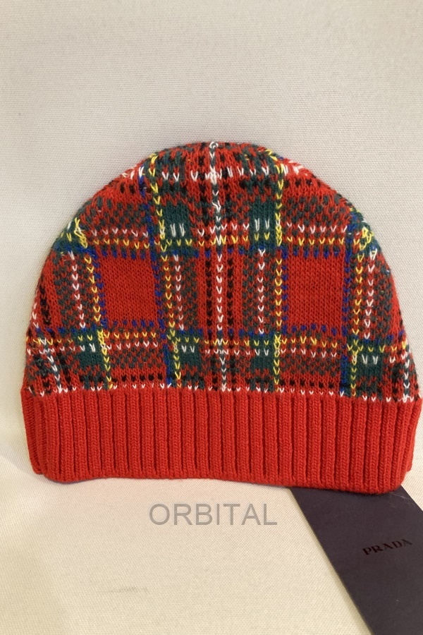 二子玉)PRADA プラダ 未使用 ウールカシミヤチェックニットキャップ ビーニー 赤 柄 ニット帽 帽子 サイズ M 44cm 国内正規