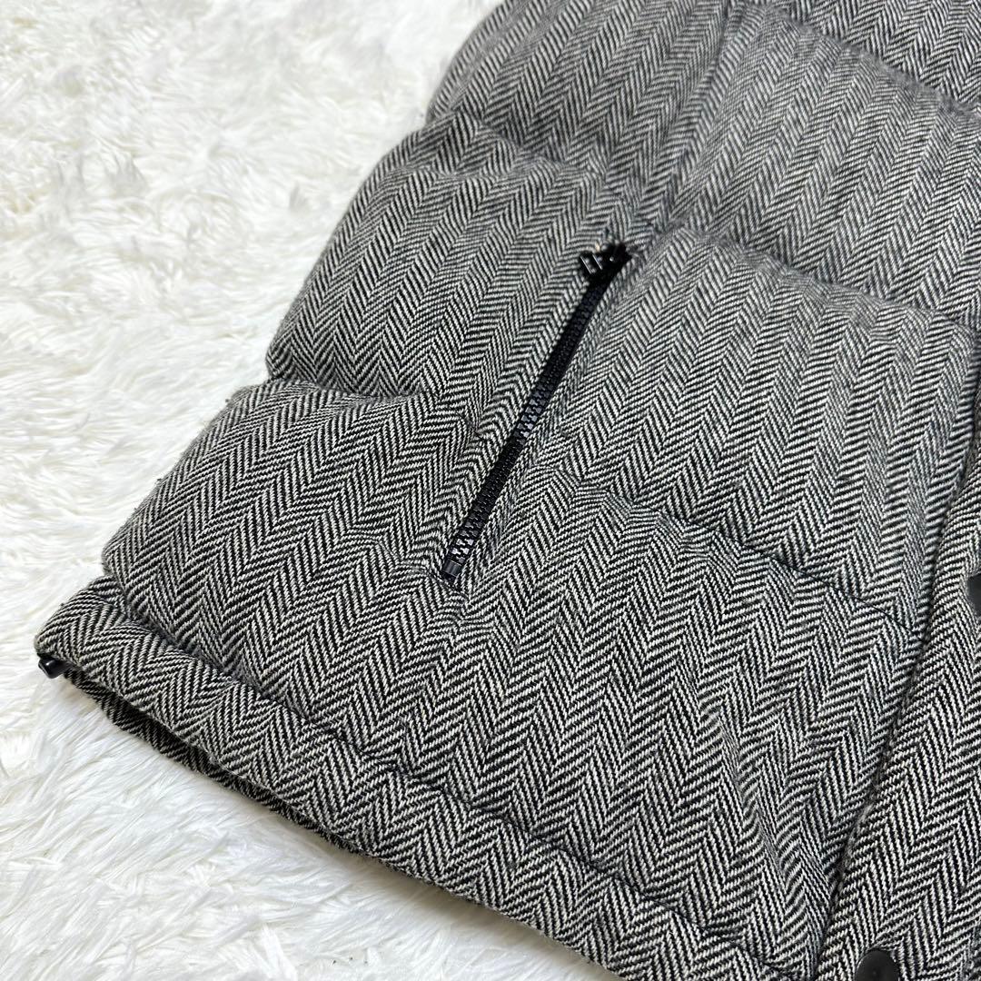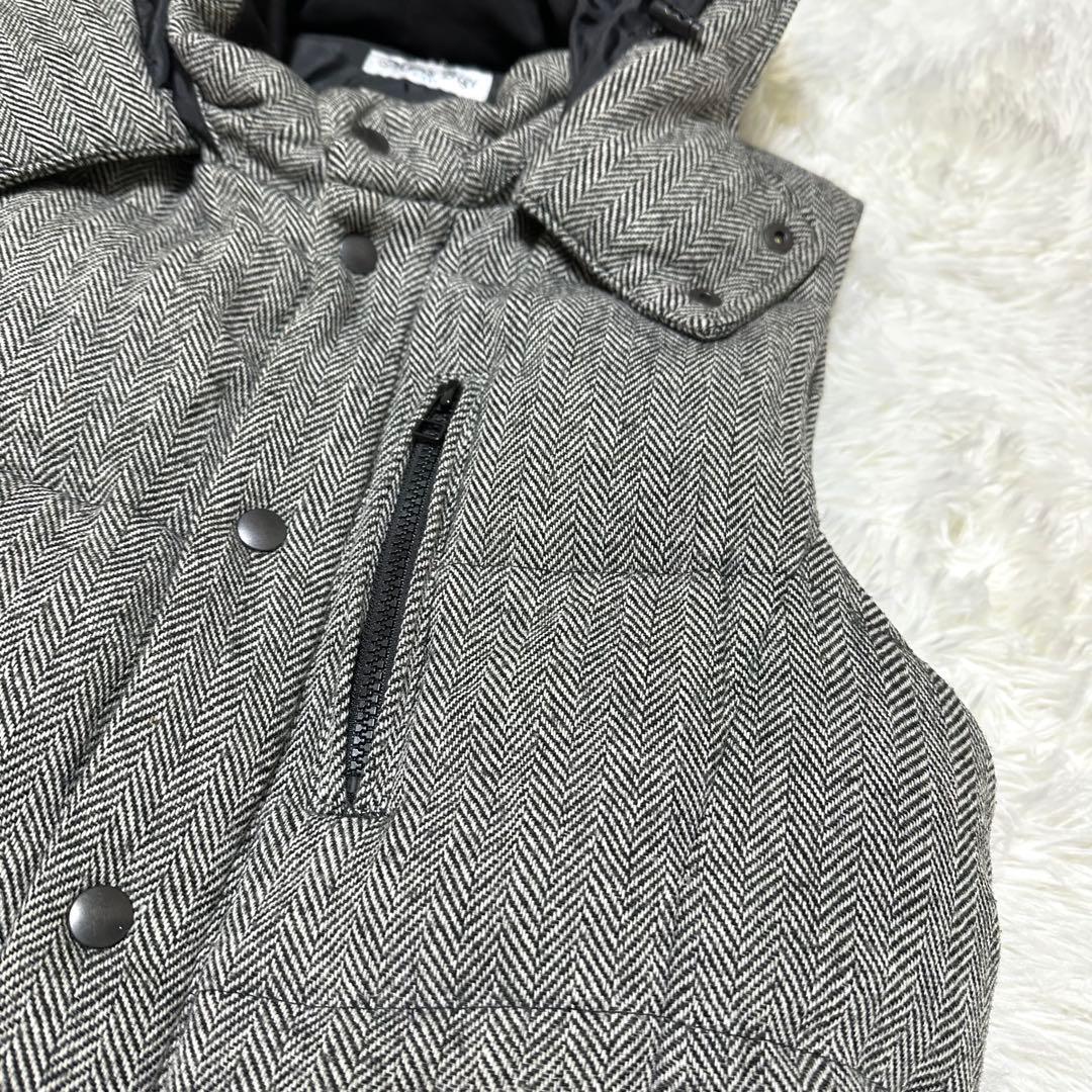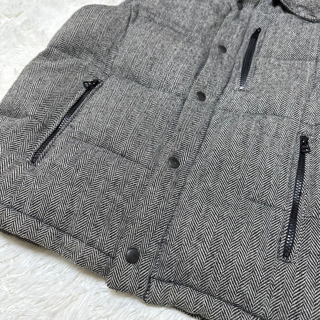 グレーのヘリンボーンパターンのダウンベストです!取り外し可能なフードとサイドポケットが特徴で、暖かさと機能性を兼ね備えています。カジュアルからキレイめまで幅広く活躍する一枚。首元部分やや色変わりしておりますが、ヘリンボン柄なのであまり目立たないかと思います。