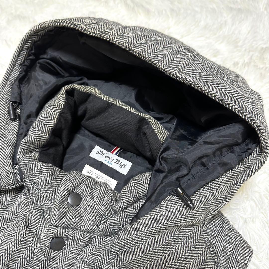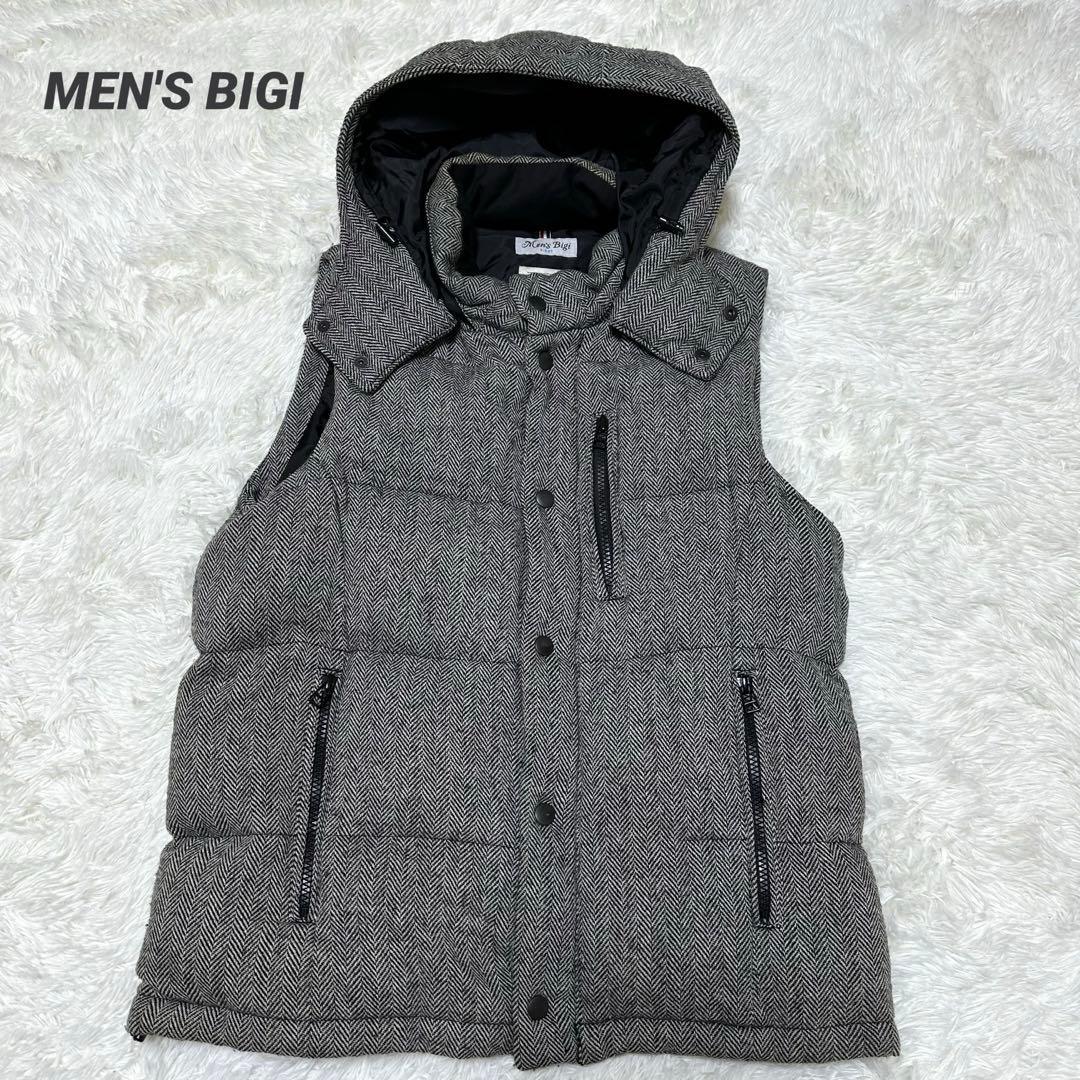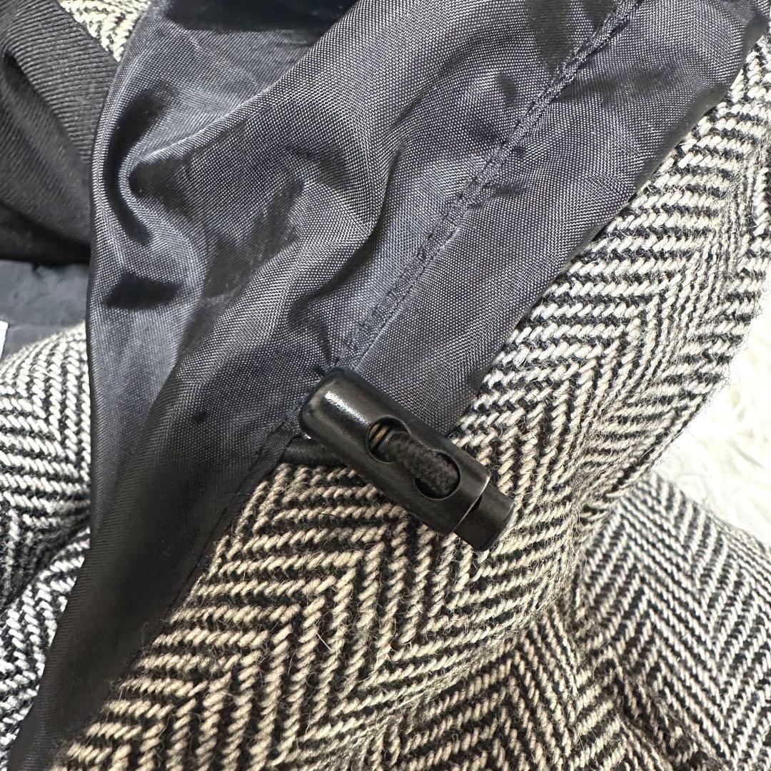 グレーのヘリンボーンパターンのダウンベストです!取り外し可能なフードとサイドポケットが特徴で、暖かさと機能性を兼ね備えています。カジュアルからキレイめまで幅広く活躍する一枚。首元部分やや色変わりしておりますが、ヘリンボン柄なのであまり目立たないかと思います。