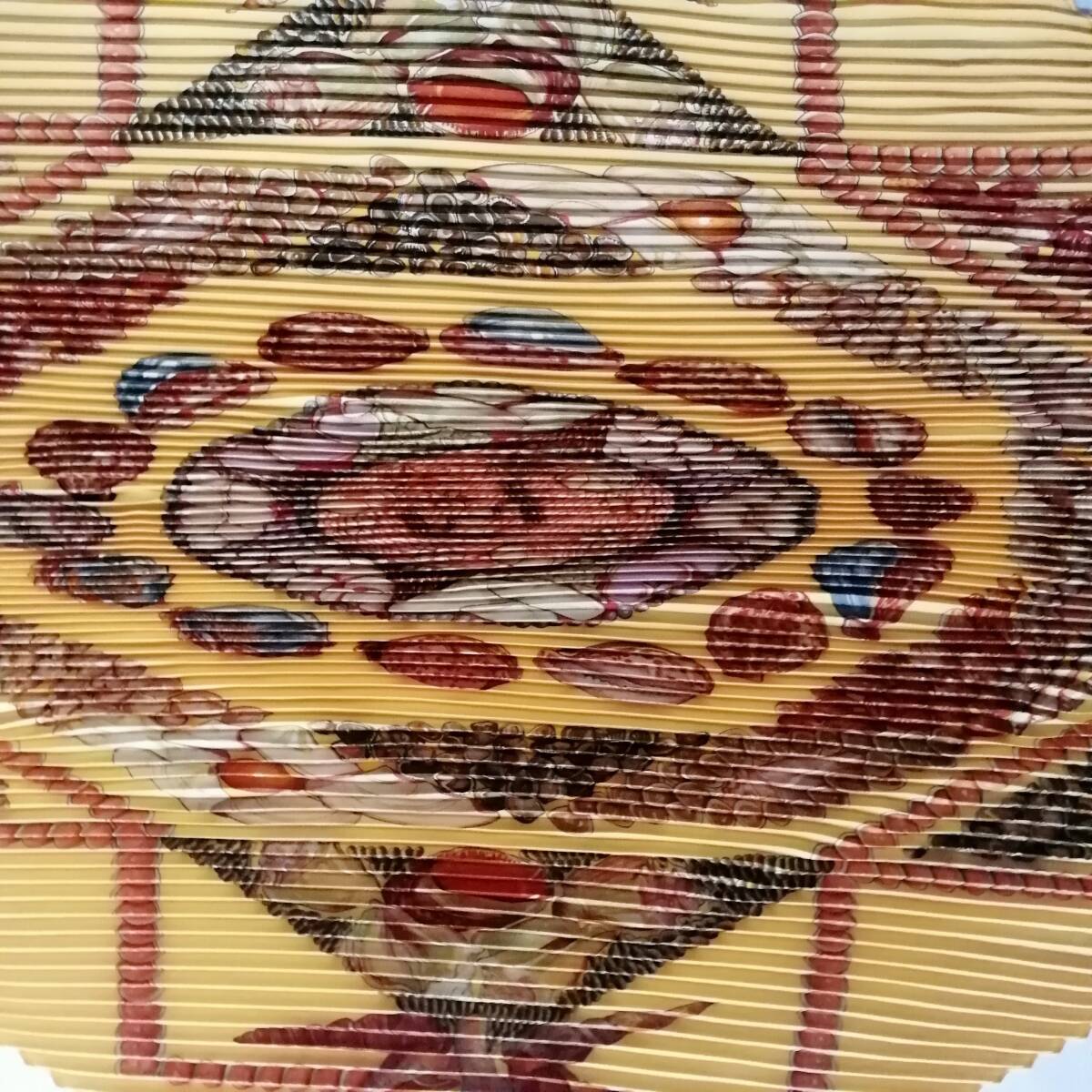 色は黄色の地に柄は茶やオレンジ、グレーなど。