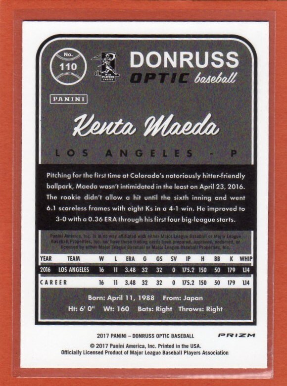 2017PANINI - DONRUSS OPTIC BASEBALL PRIZM #110 前田健太ファンの方、是非どうぞ! |