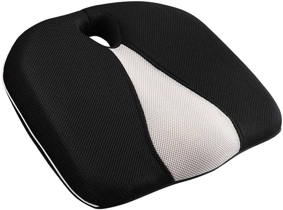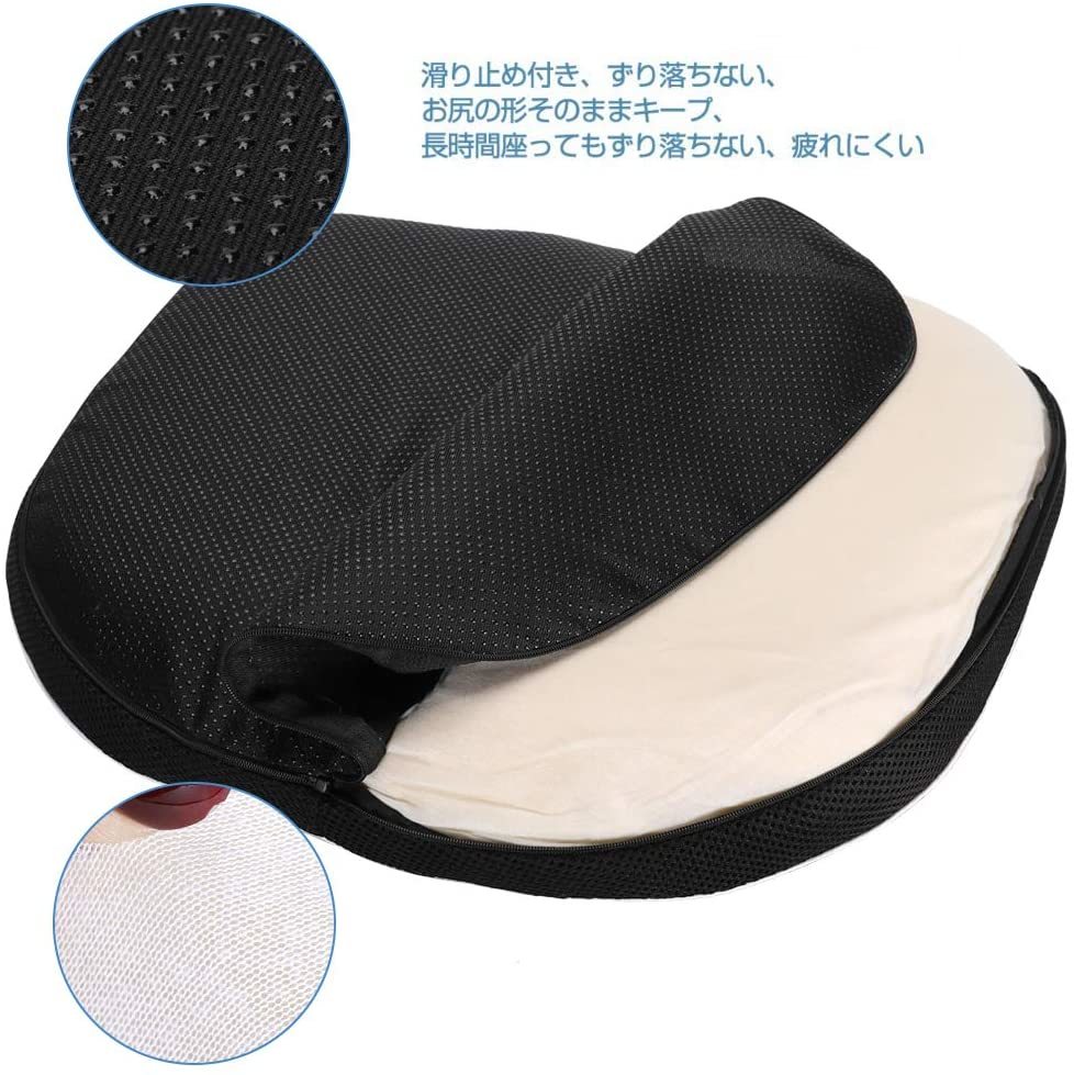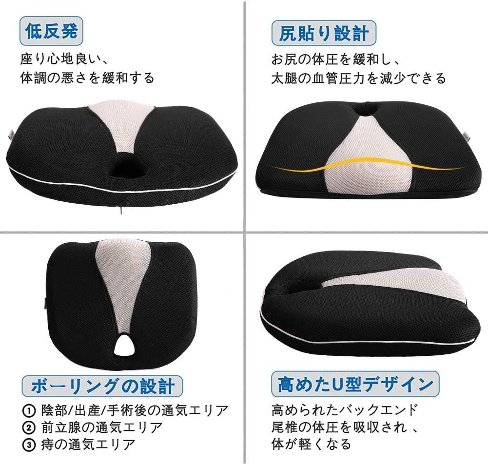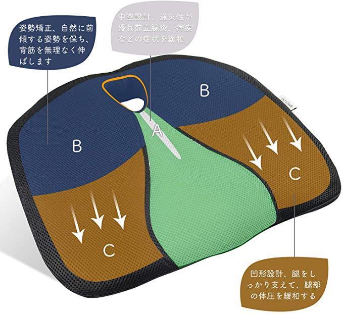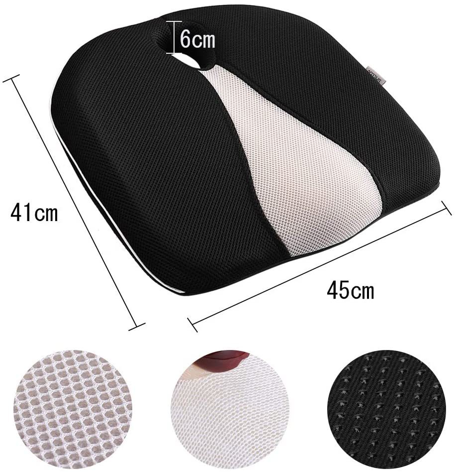 【人間工学設計低反発クッション】弧線形状の両側はお尻に優しくフィットし、お尻にかかる圧力を分散します。後端を高くすることによって、尾てい骨の圧力が吸収され、座り心地良いです。線形の設計で太ももへの圧迫を軽 減し、長時間座っても疲れにくいです。クッション中間の中空デザインにより、長時間座っていても蒸し暑くないです。形に合わせて座れば、自然に前傾する姿勢を保ち、背筋を無理なく伸ばします。