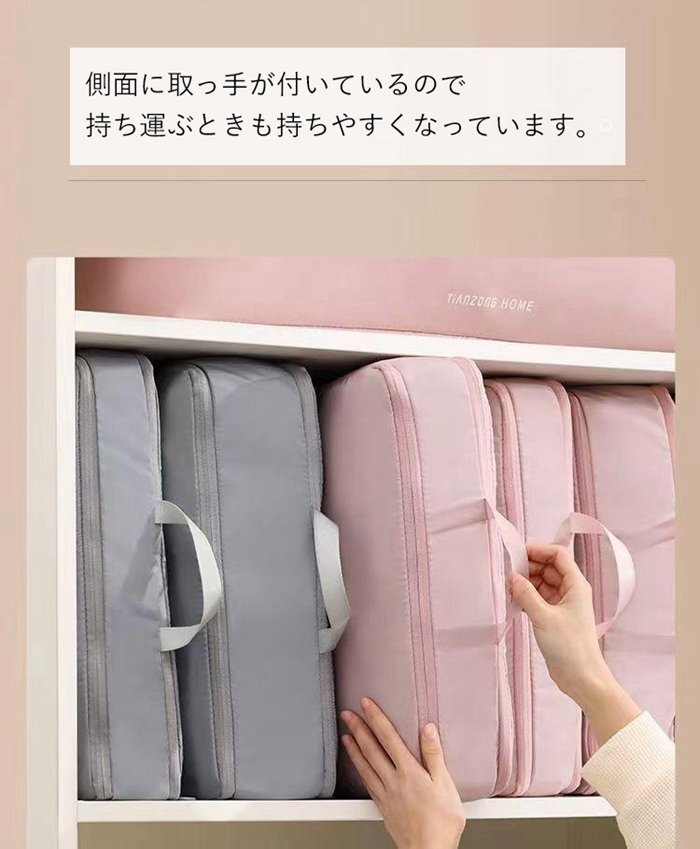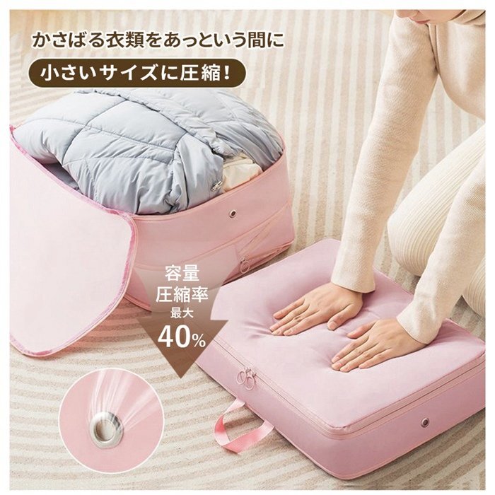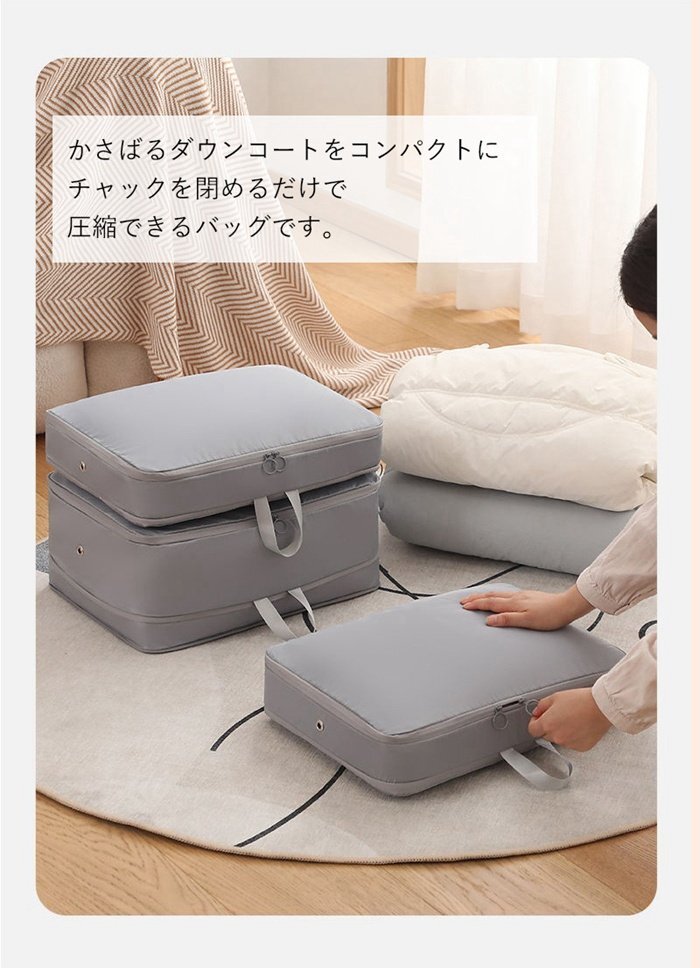 かさばる衣類があっという間に小さいサイズに!チャックを閉めるだけで圧縮できるバッグです。