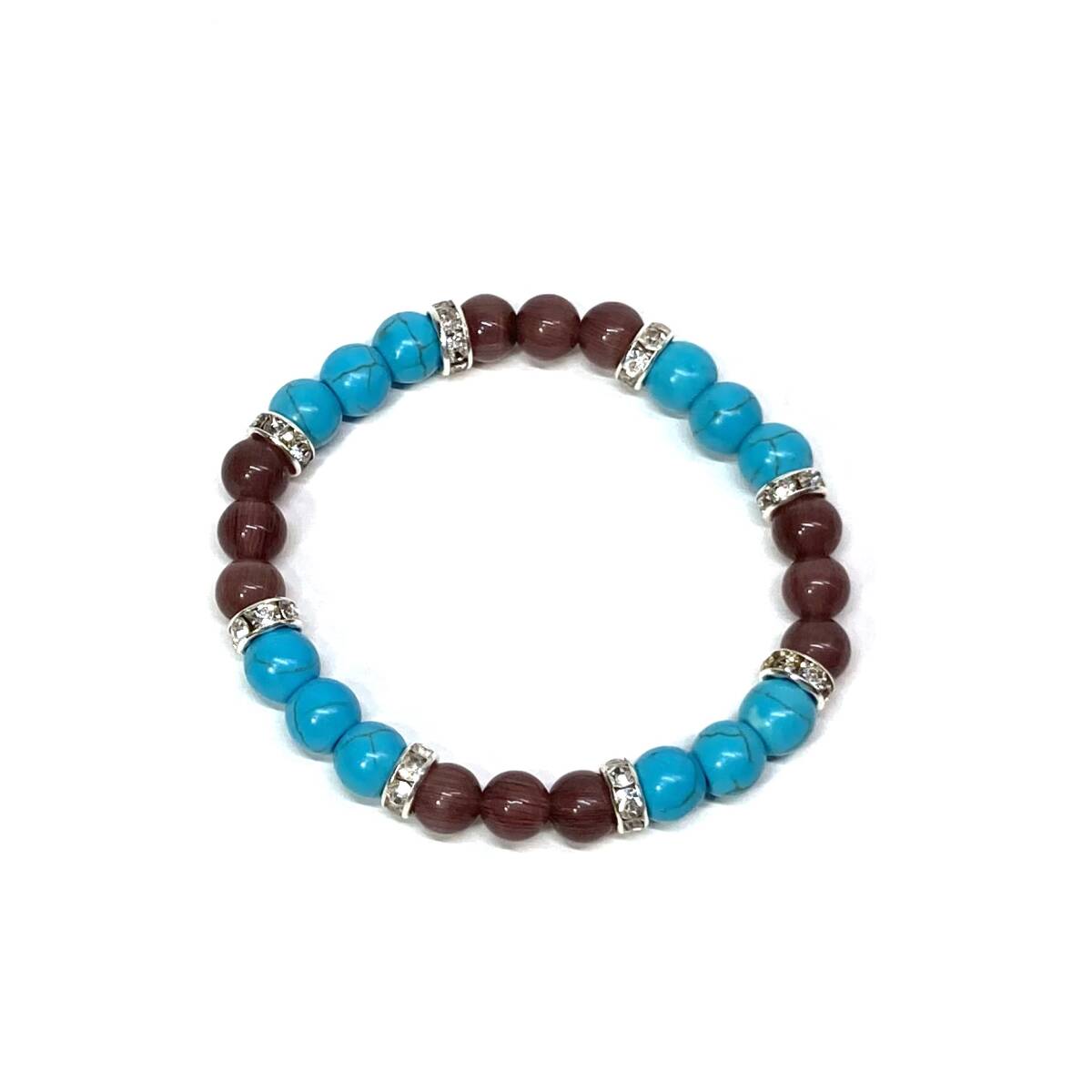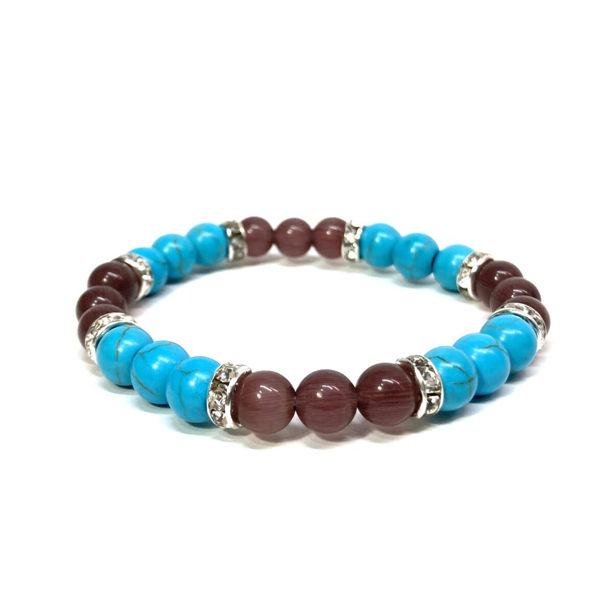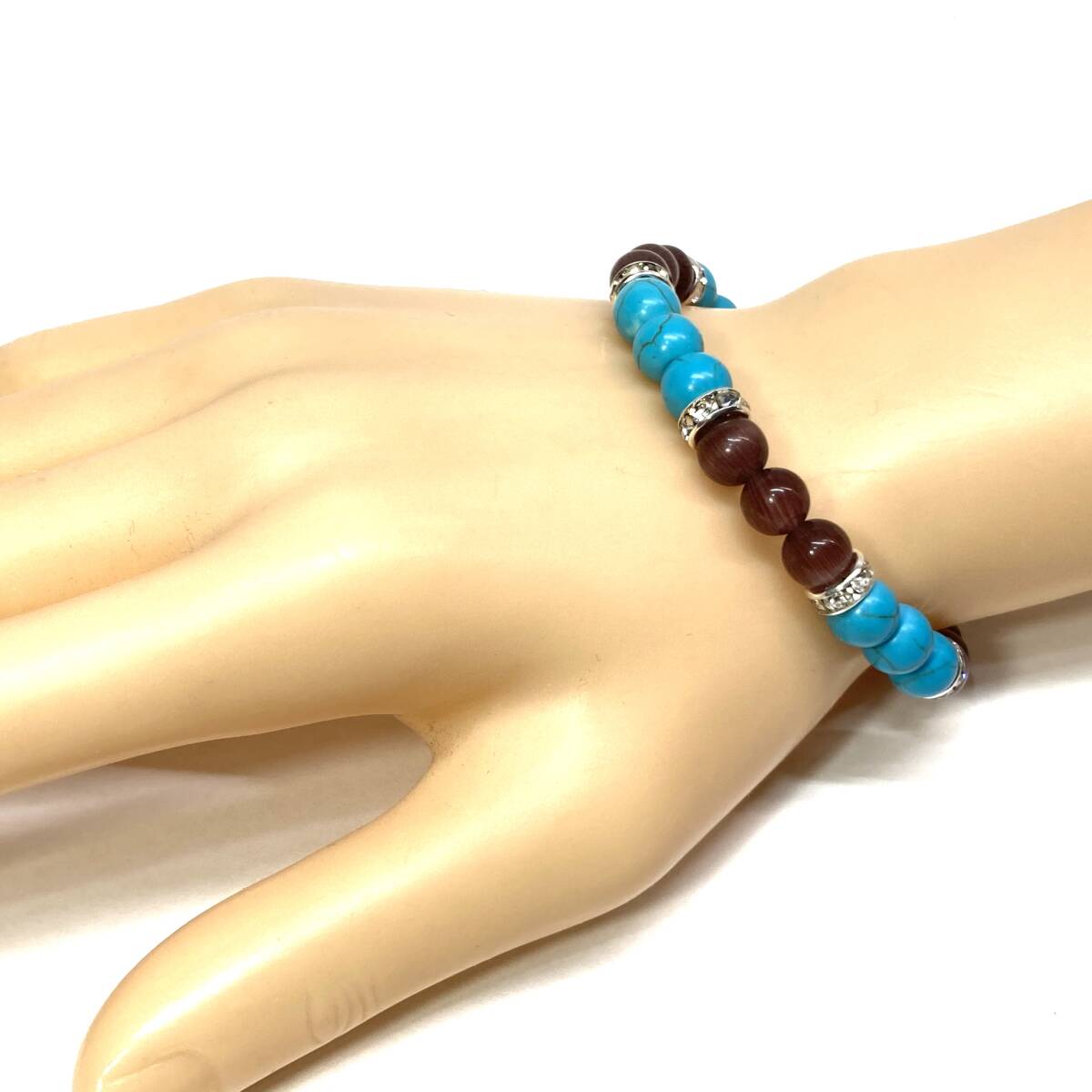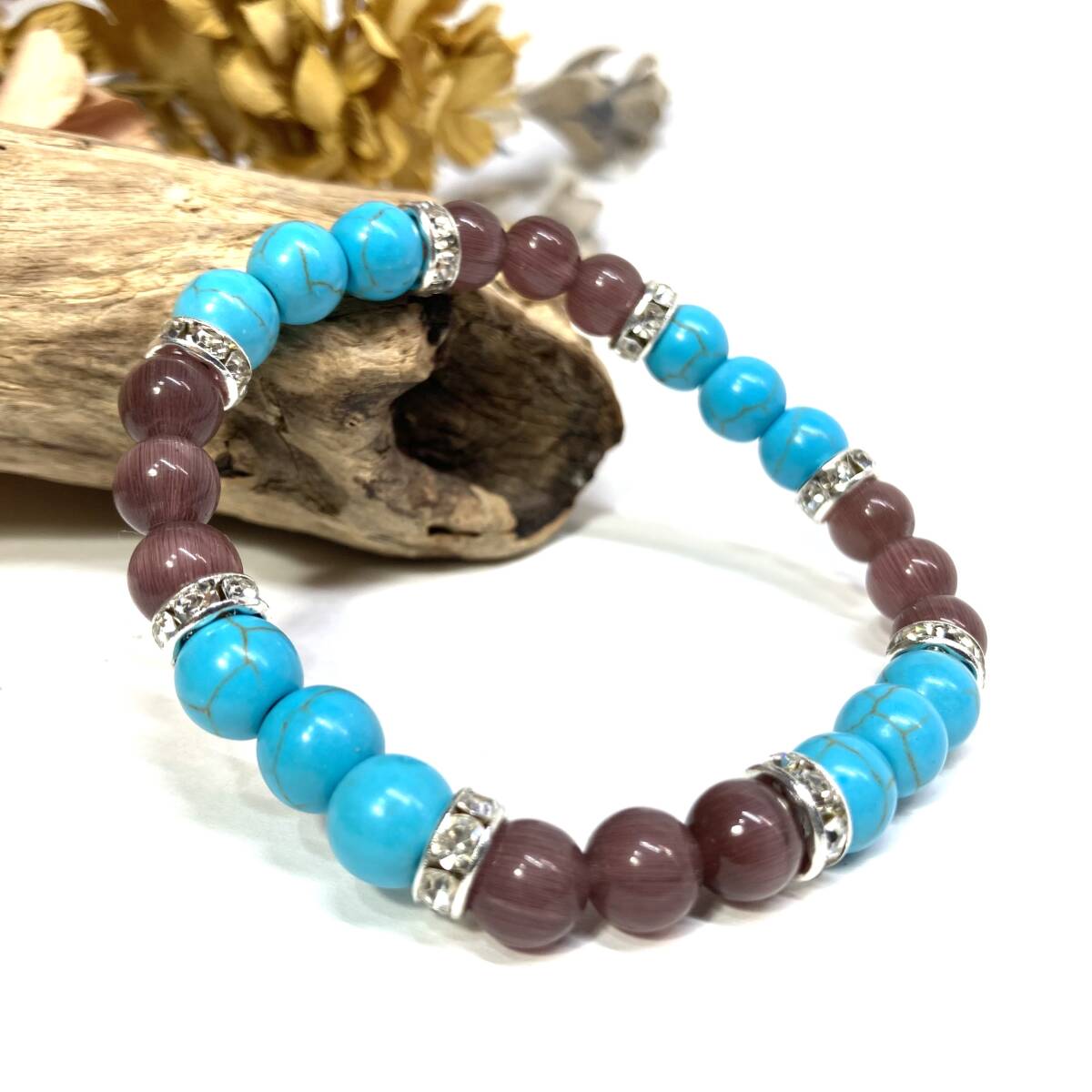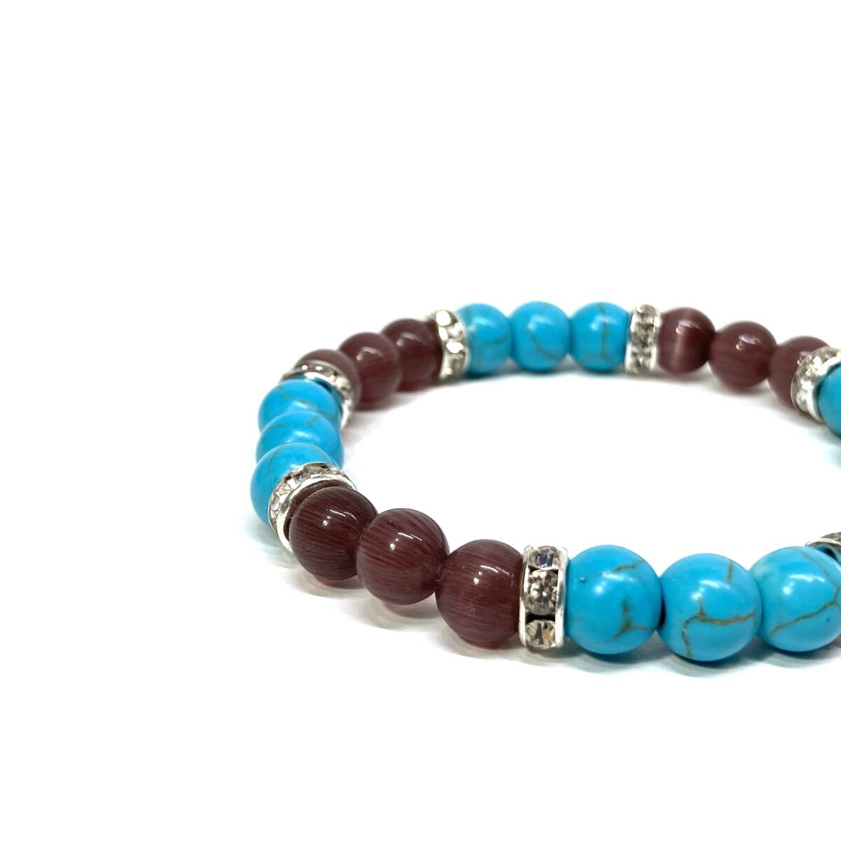 こちらは、8mm玉のホワイトキャッツアイとターコイズを使用したパワーストーンブレスレットです。間にはロンデルを挟み高級感ある大人っぽいデザインに仕上がっています。内周約16cmです。気になる方は是非この機会にどうぞ。