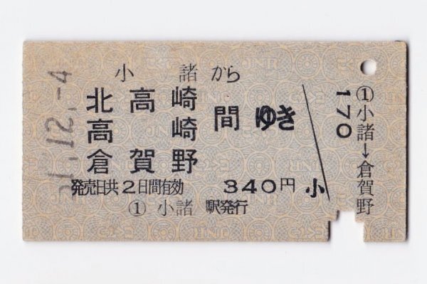 ●国鉄●【 小諸から北高崎・高崎・倉賀野 間ゆき 340円 】A型券 昭和51年 小諸駅発行【00896】