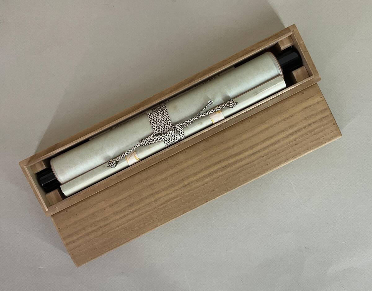 古い掛け軸は軸先を固定している接着剤が弱り、輸送途中の衝撃で軸先が外れてしまう場合がございます。