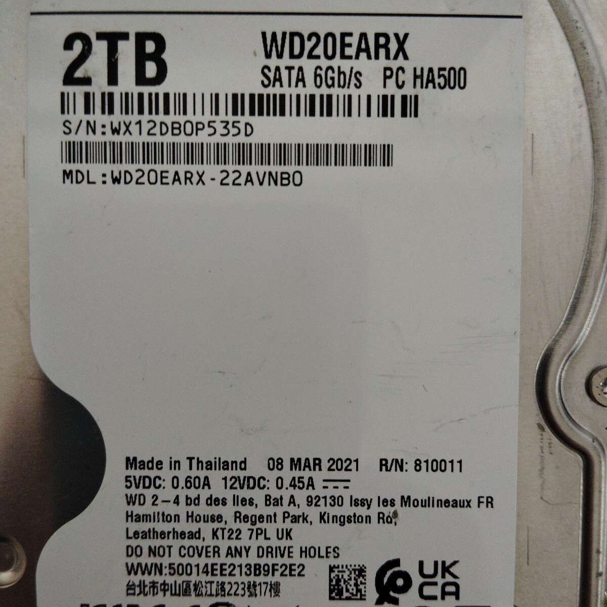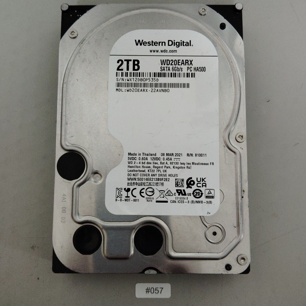 HDD 2TB Western Digital WDC WD20EARX-22AVNB0 ハードディスク 正常 #057