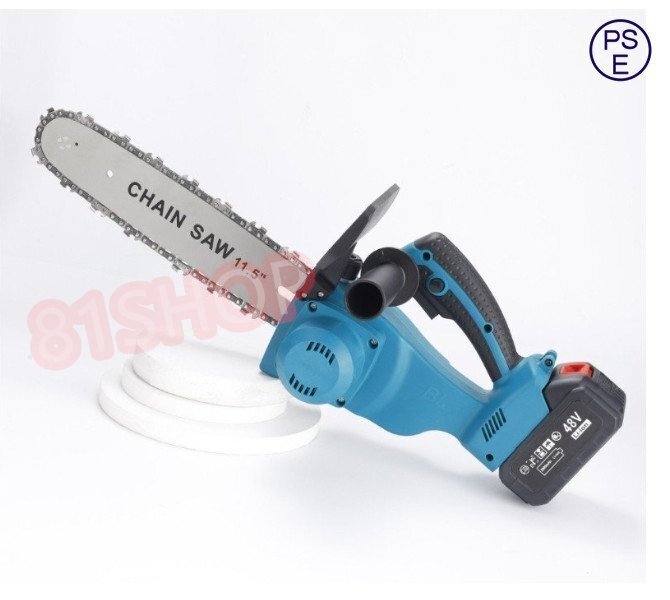 大容量48Vリチウムイオンバッテリー1個付きで、15cmの木30本ぐらいを楽に切れて、十分に作業できます。