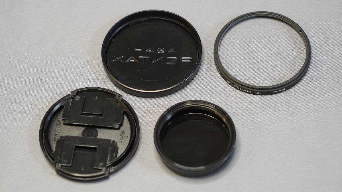 1枚めの写真に含まれているものが、出品物のすべてです。すなわち、レンズ本体、レンズフィルター(Kenko MC PROTECTOR 58mm)、かぶせ式レンズキャップ、樹脂製のレンズキャップとレンズマウントキャップです。