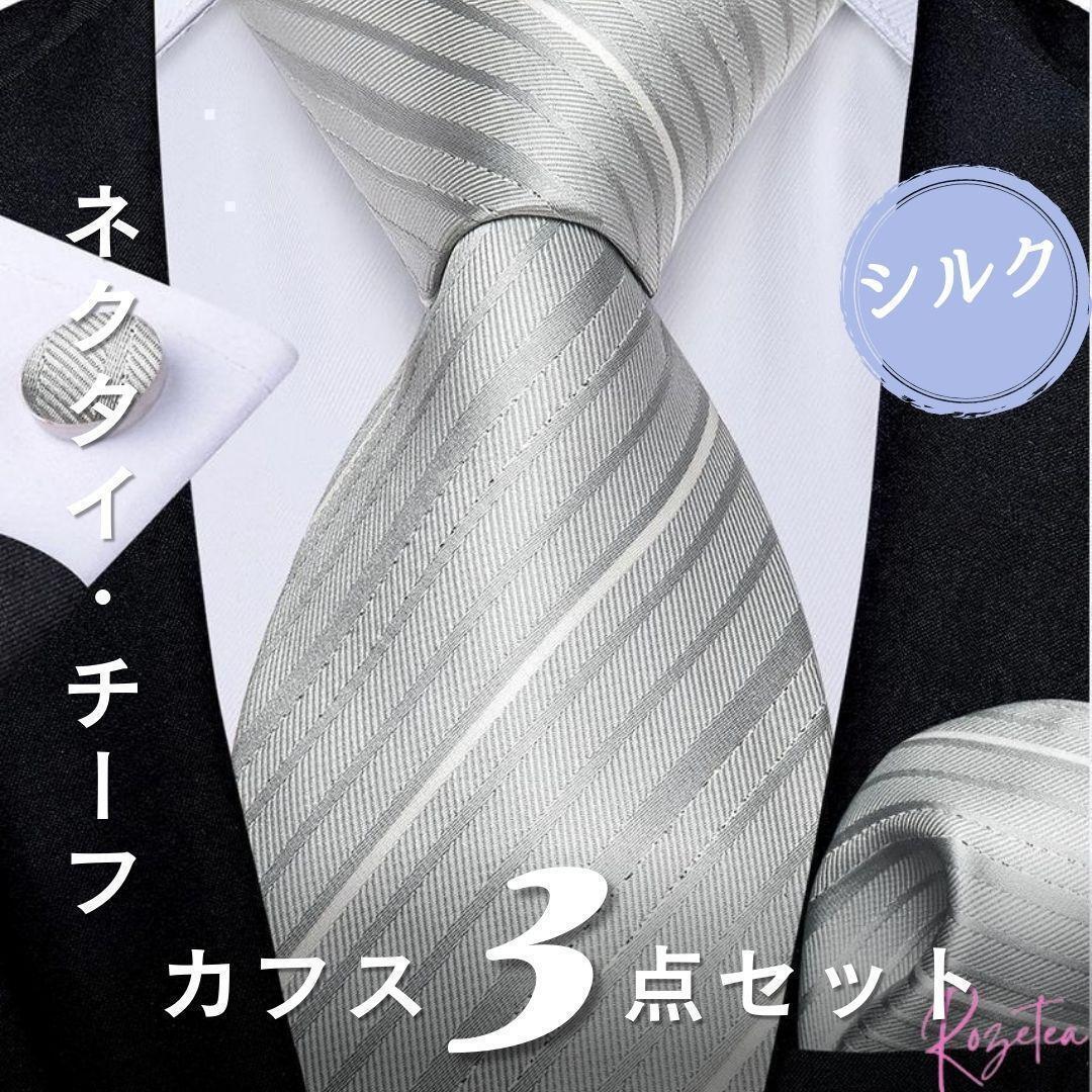 ネクタイ・ポケットチーフ・カフスの3点セットです。