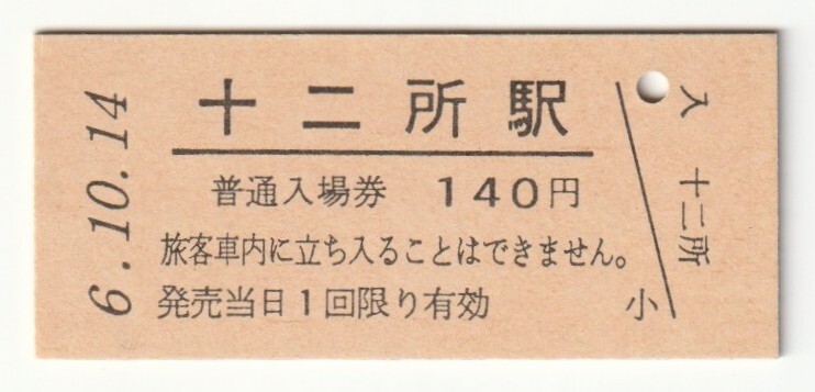 平成6年10月14日 花輪線 十二所駅 140円硬券普通入場券(日付印刷)