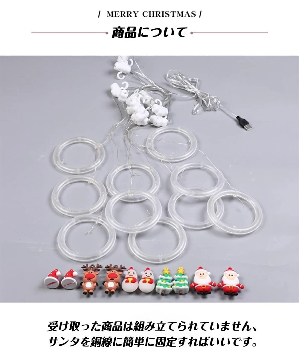 | 【取り付け簡単】 | クリスマスデコレーションライトのパッケージには10個のリングライトと飾りが入っております。リングライト1個と飾り1個と合わせてセットになって使用することができます。クリスマス飾りをリングライトの銅線に掛けて固定すればよいです。USB電源を入れますと、あなたがクリスマスイブの光りに包み込まれます。 |