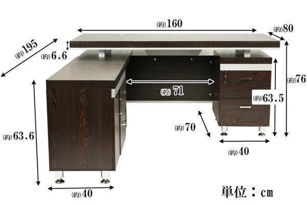 | 商品サイズ | ■メインデスク・・・・・・約160(幅)x約195(奥行き)x約76(高さ)(cm) ■天板の厚み・・・・・・・・・・約6.6(cm) |
