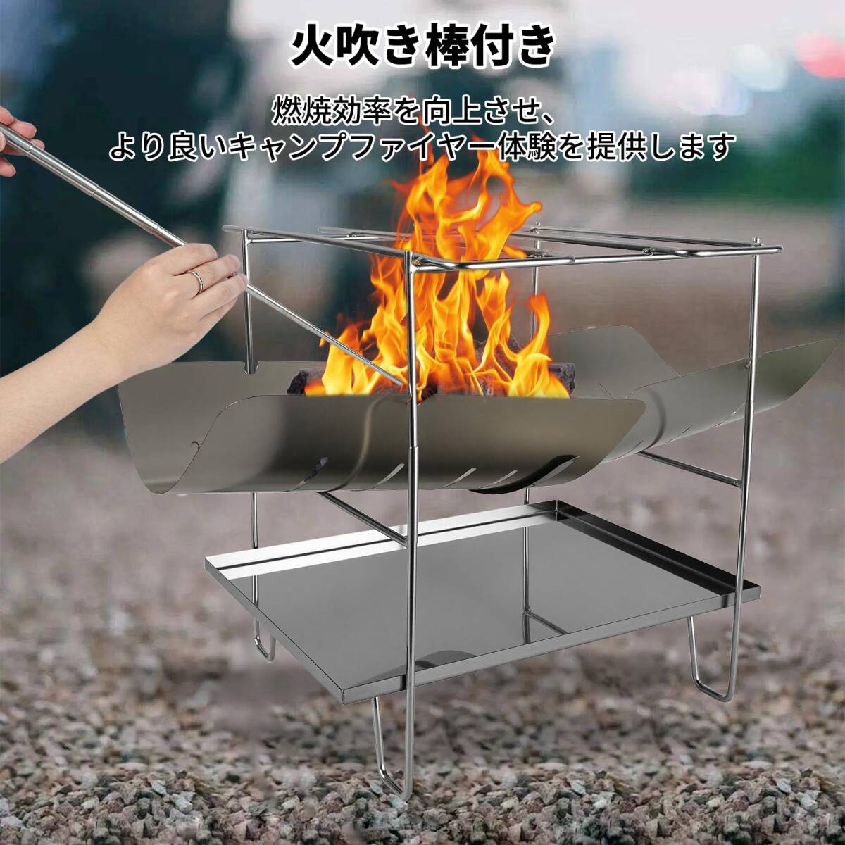 【折りたたみ可能】使わない時に折りたたむことができ、場所を取りません。収納サイズはコンパクトで持ち運びやすいです。キャンプ、バーベキュー、釣り、さらにはバイクやハイキングなど、さまざまな屋外の場面でキャンプファイヤーの楽しさを楽しみたい人にとって便利です。