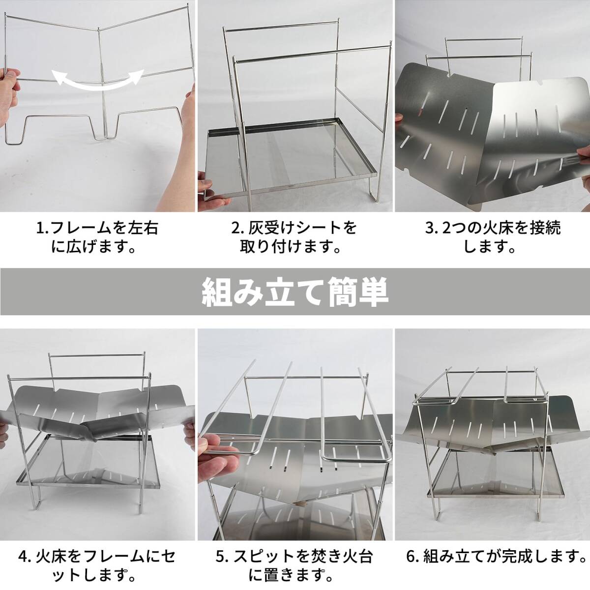 【組み立て簡単】 1.フレームを左右に広げます。 2. 灰受けシートを取り付けます。 3. 火床(ロストル)をセットします。 4. スピットを焚き火台に載せて完成です。