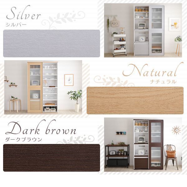 【ポイント】 スライドタイプの新しい食器棚です。 収納スペースを左右に分け、左側に家電収納棚やフルオープンの引出し 右側に計8段の食器収納棚を設け ガラスのスライドドアで楽に開閉・切替が可能です。 |