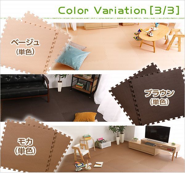 【カラー】 ベージュ、ベージュ&ブラウン、ベージュ&グリーン、ベージュ&モカ ベージュ&ピンク、ベージュ&イエロー、ブラウン、モカ 【サイズ】 外寸(1枚当たり):幅61cmx奥行き61cmx厚み1cm サイドパーツ付属時:幅62cmx奥行き62cmx厚み1cm 【重量】 7.8kg 【素材】 EVA樹脂 【梱包】 サイズ:63.5×63.5×34cm、重量:9.1kg 【ご注意】 サイズ、重量は概算です。 |