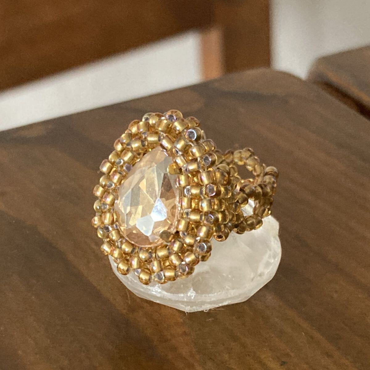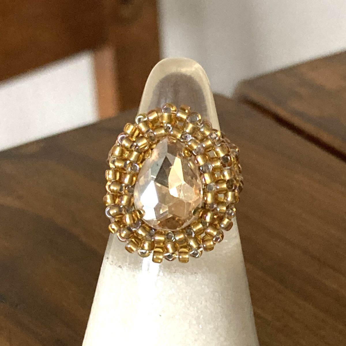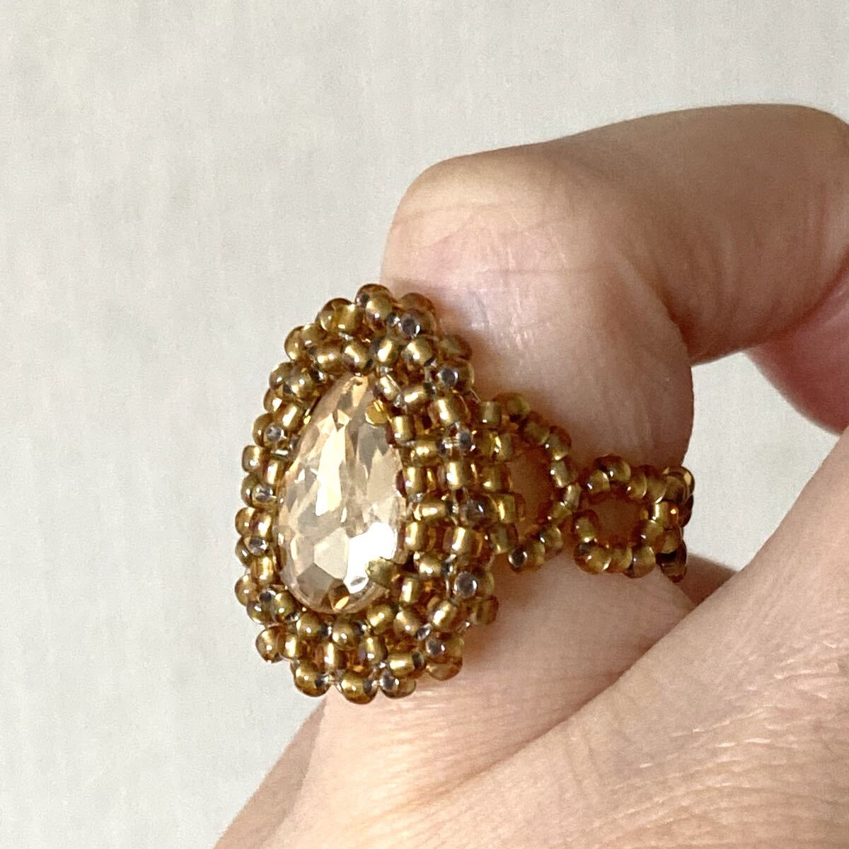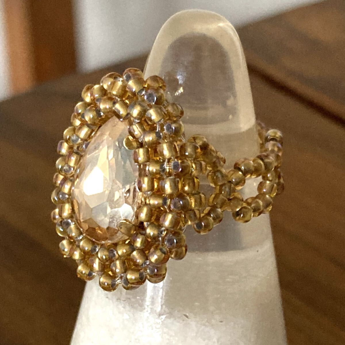 ドロップ型のラインストーンの周りを丸小ビーズで細かく編んだデザインのリングです♪