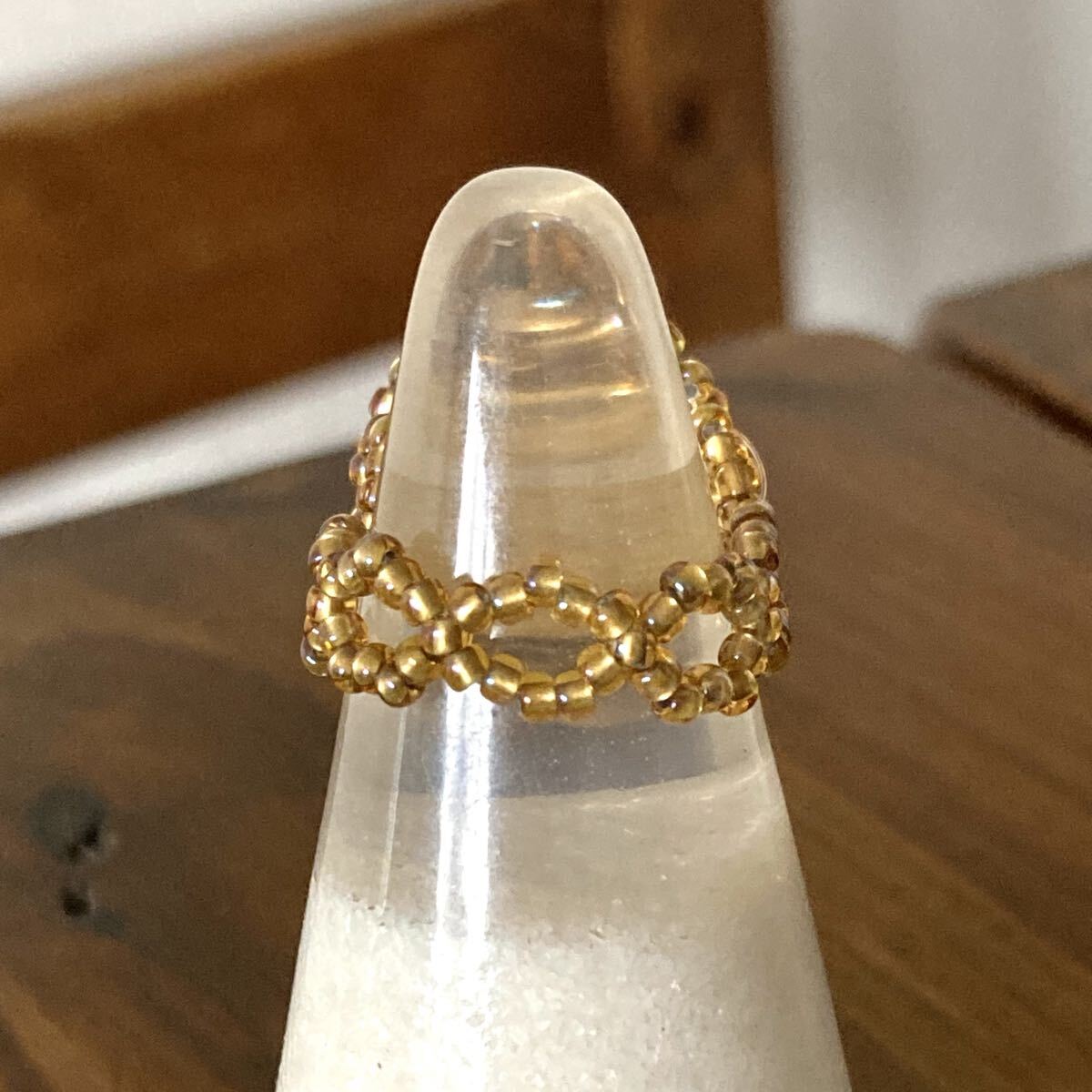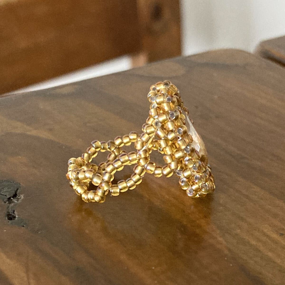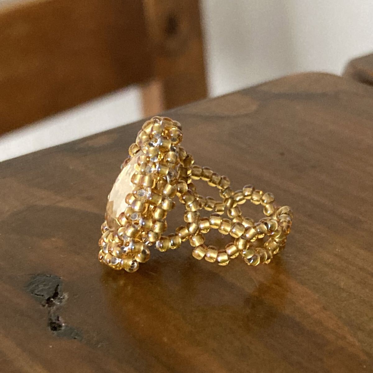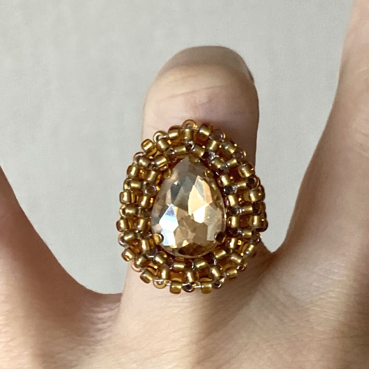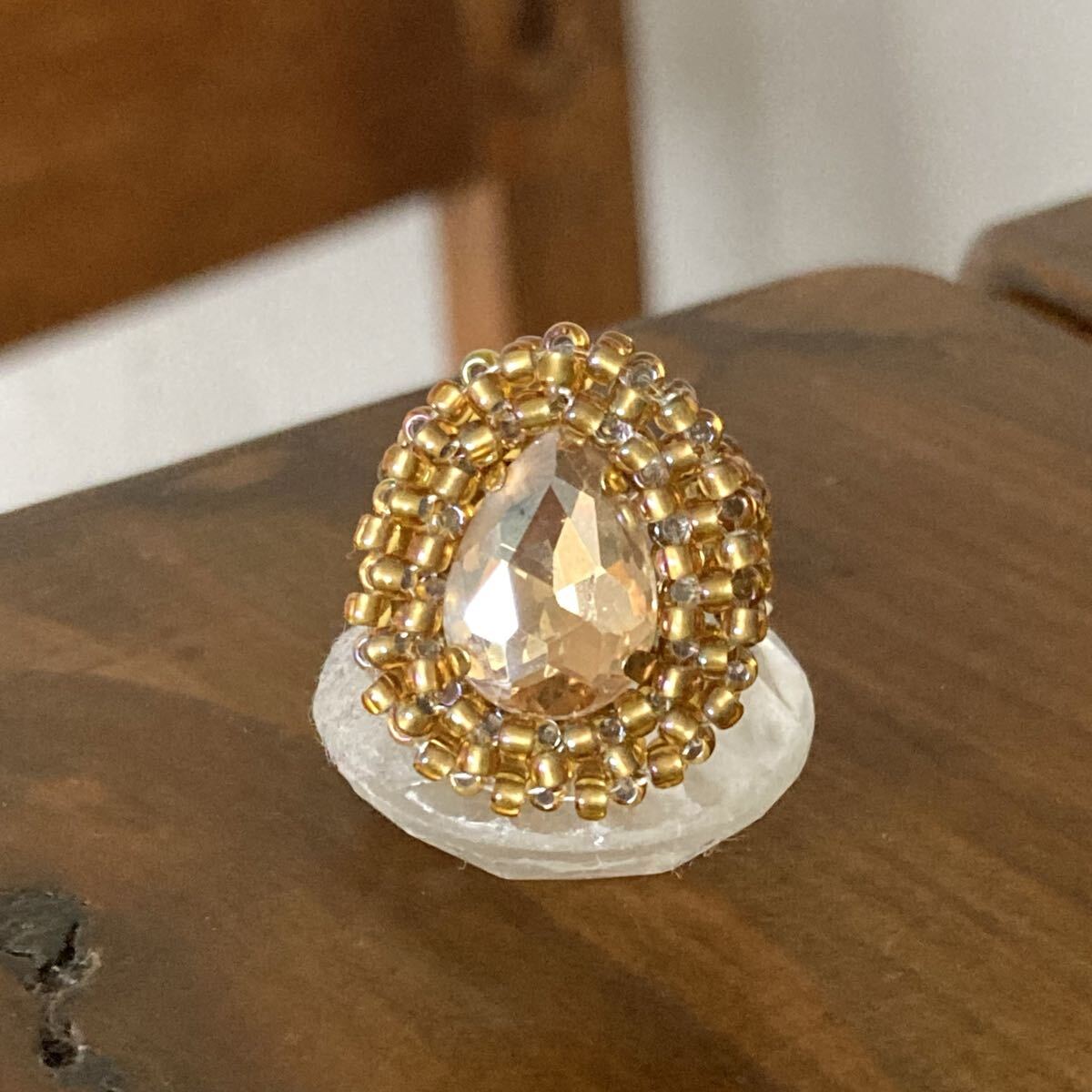 ドロップ型のラインストーンの周りを丸小ビーズで細かく編んだデザインのリングです♪